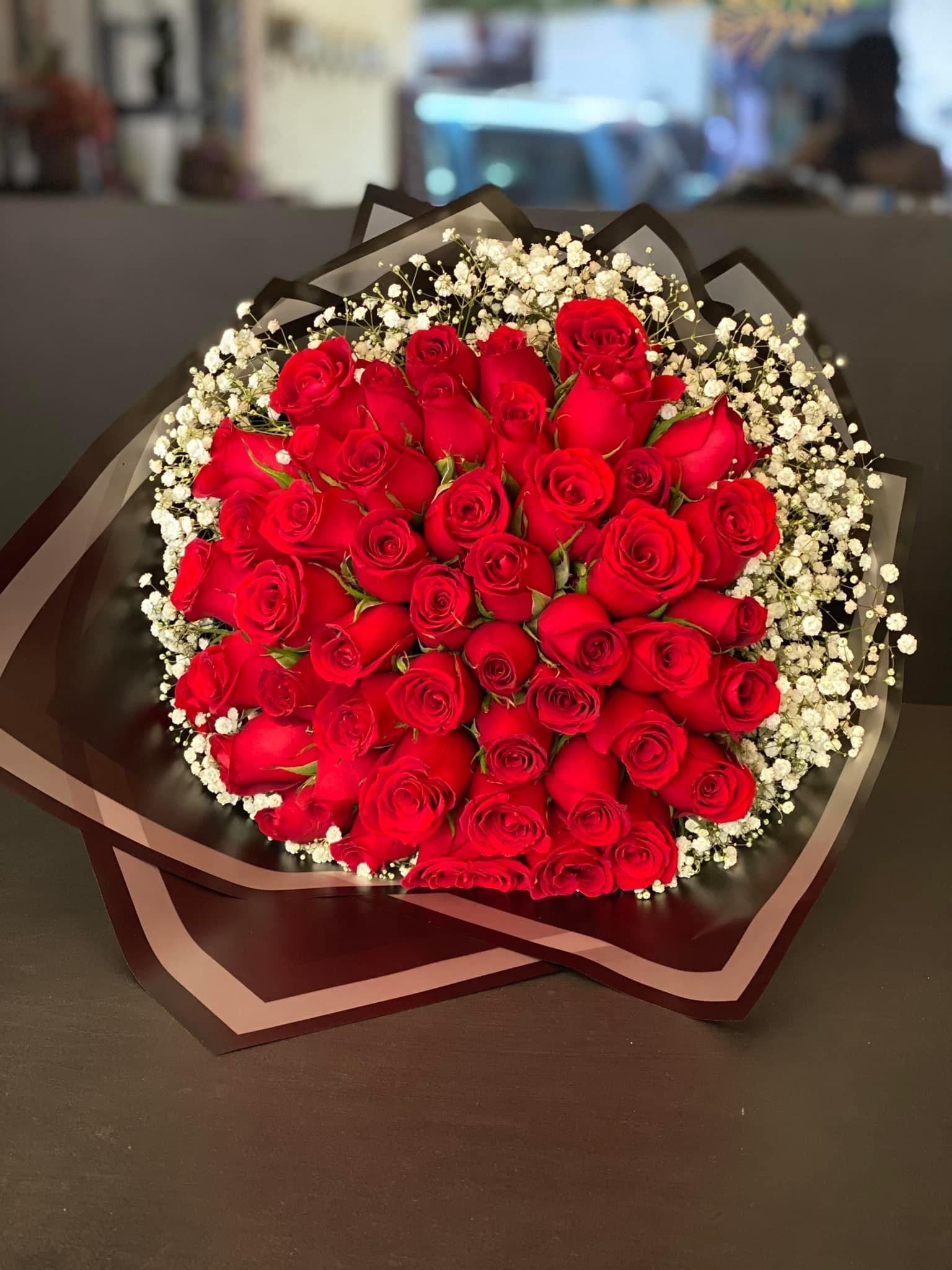 50 Rosas! Lleve 50 hermosas rosas rojas con delicada gypsophila alrededor. Aumente la pasión con estas flores, perfectas para expresar amor y admiración. Obtenga la combinación perfecta de romanticismo y elegancia con 50 Rosas. ¡Sorprenda a su ser querido hoy mismo!