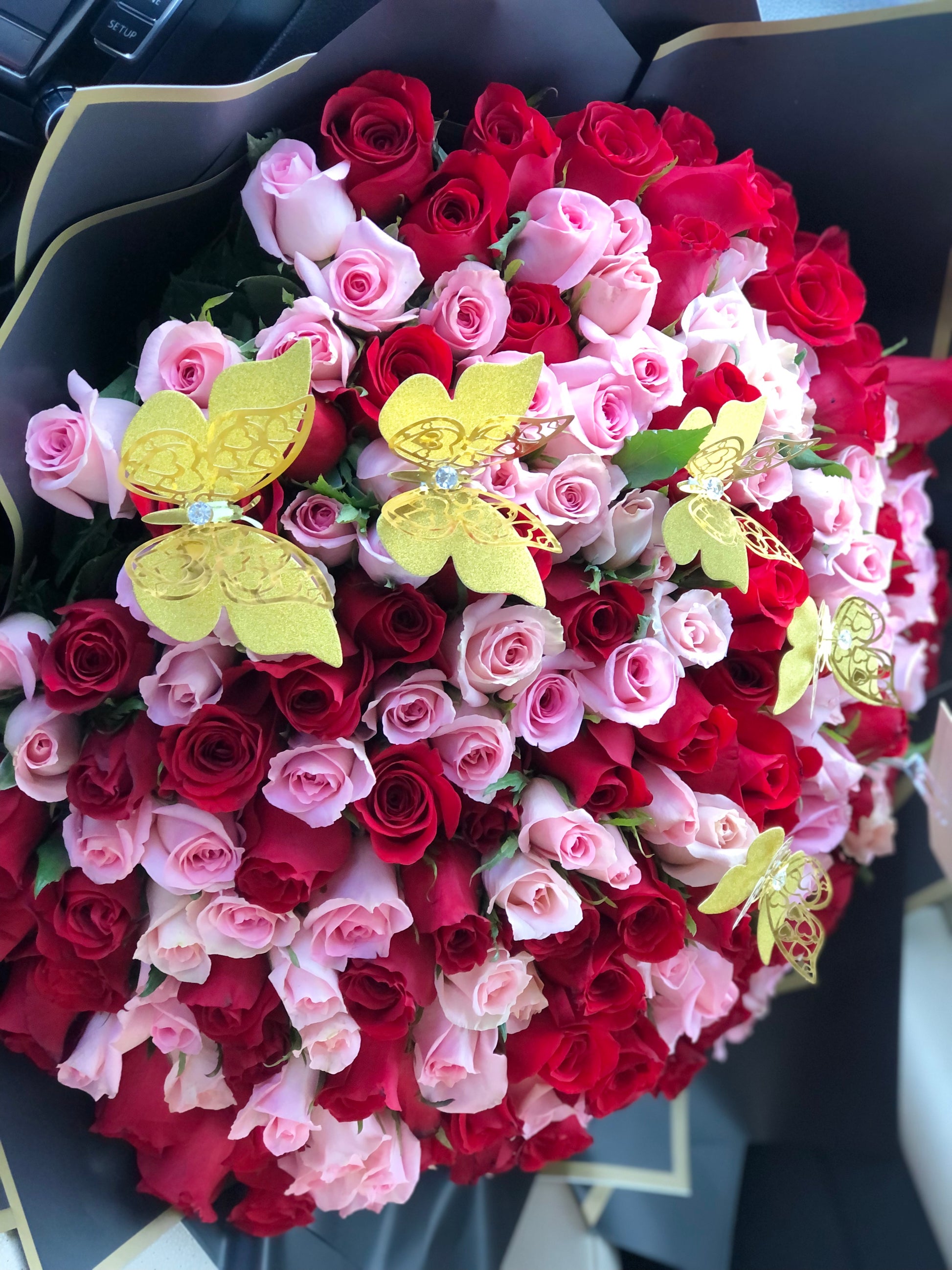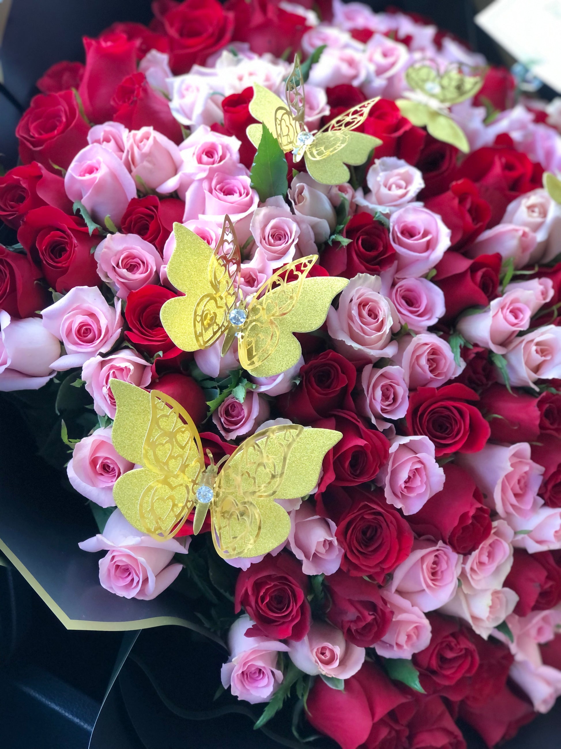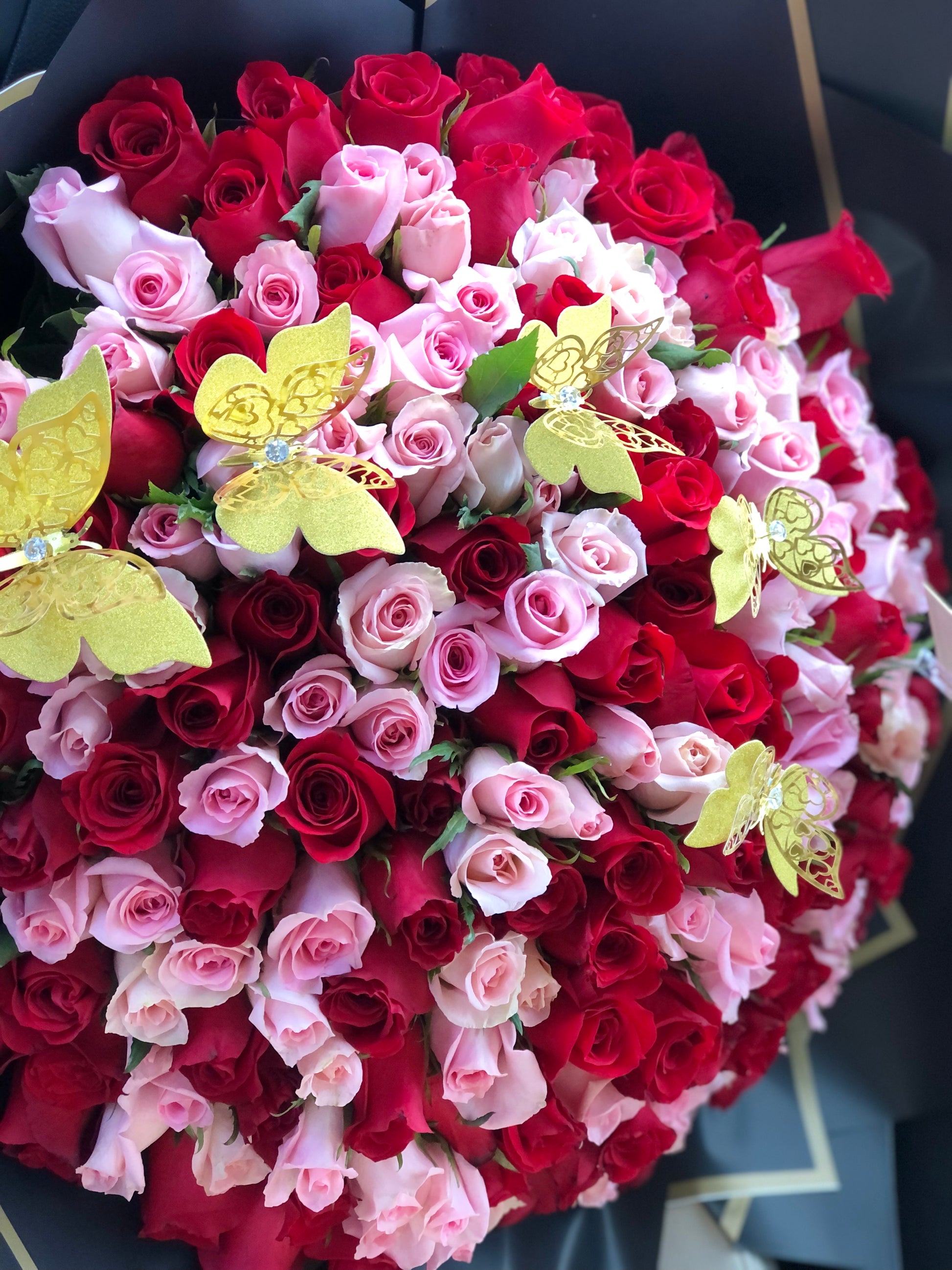 "El Ramo Camila es una obra maestra floral: 300 rosas en dos tonos vibrantes y delicados, con adornos de mariposas y envuelto en papel coreano. Una combinación exquisita que cautiva la mirada y el corazón. Un regalo exclusivo para celebrar el amor y la belleza en su máxima expresión."