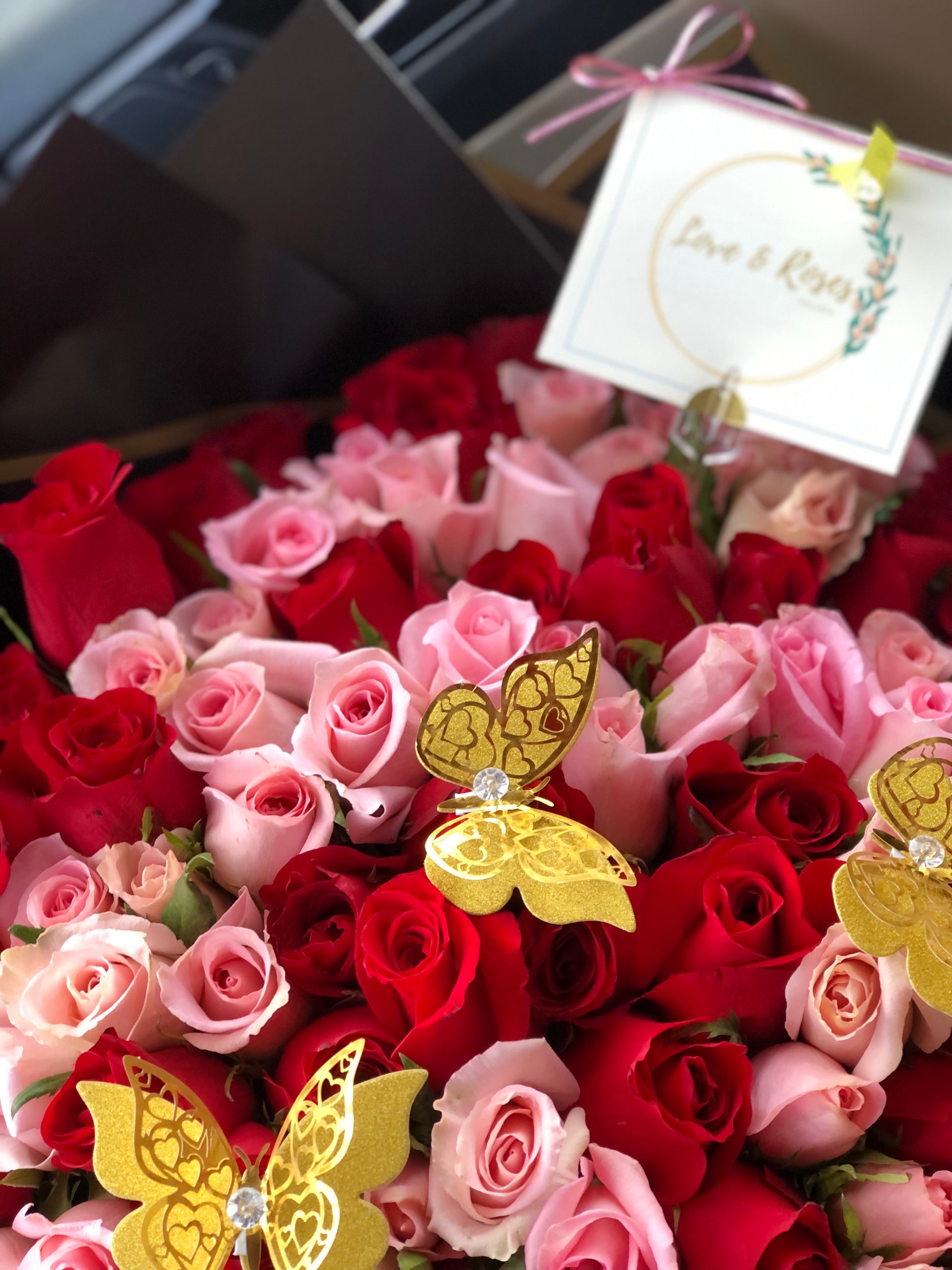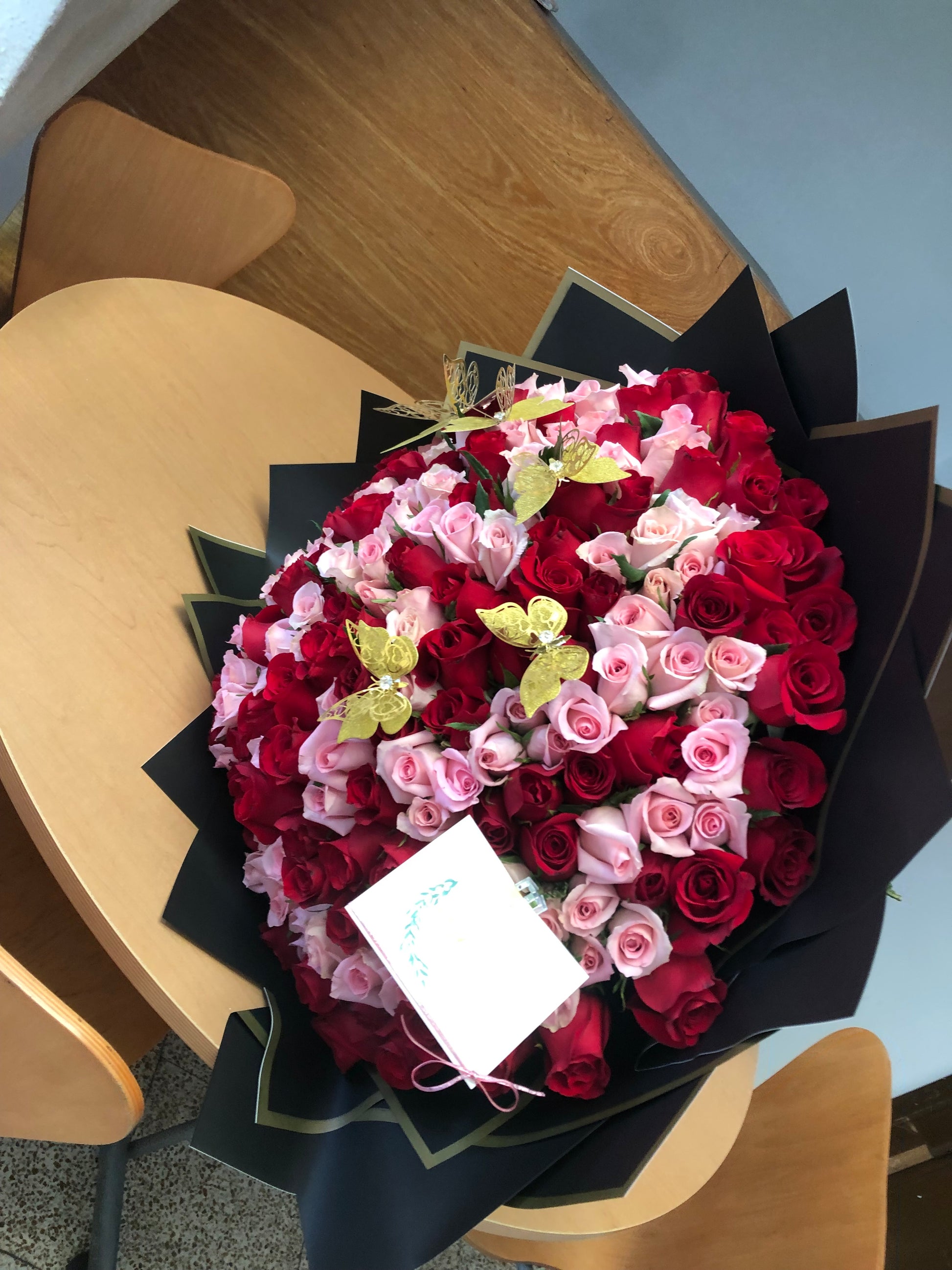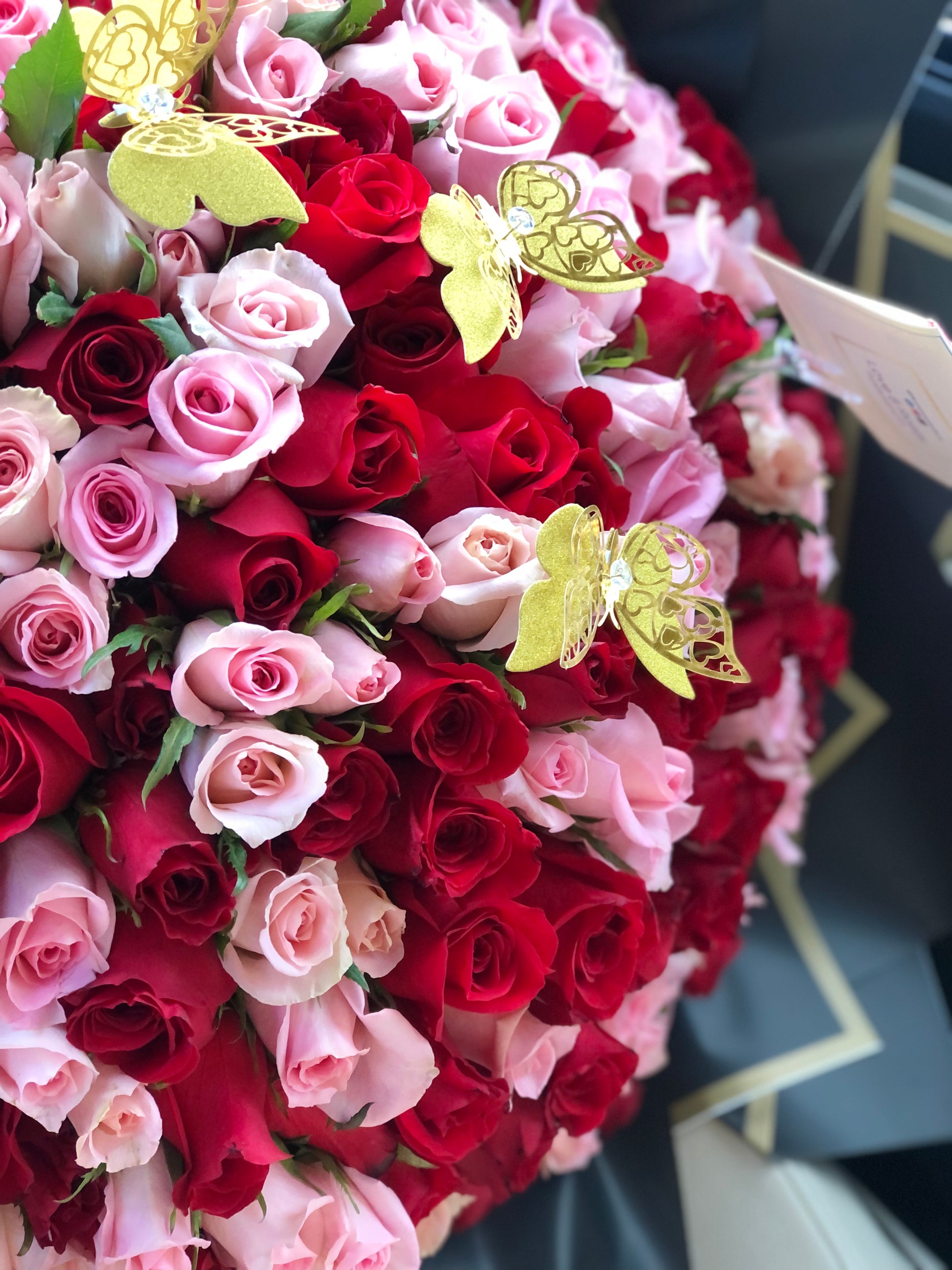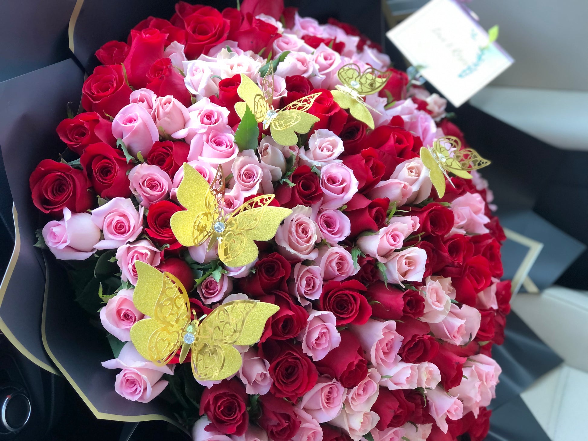 "El Ramo Camila es una obra maestra floral: 300 rosas en dos tonos vibrantes y delicados, con adornos de mariposas y envuelto en papel coreano. Una combinación exquisita que cautiva la mirada y el corazón. Un regalo exclusivo para celebrar el amor y la belleza en su máxima expresión."