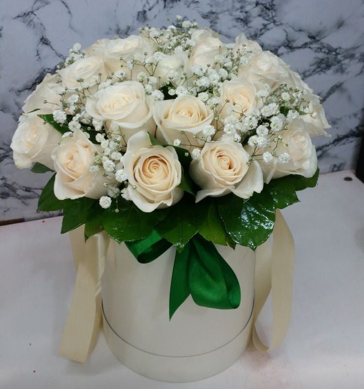 Este Cilindro es una elegante y refinada opción para regalar. Con rosas blancas como protagonistas, acompañadas por Gypsofilia y follaje fino, este arreglo floral brinda delicadeza y belleza a su dueño. Ideal para expresar amor, agradecimiento o desear felicidad, este cilindro es la elección perfecta para cualquier ocasión. ¡Haga sentir especial a esa persona querida con este hermoso regalo!