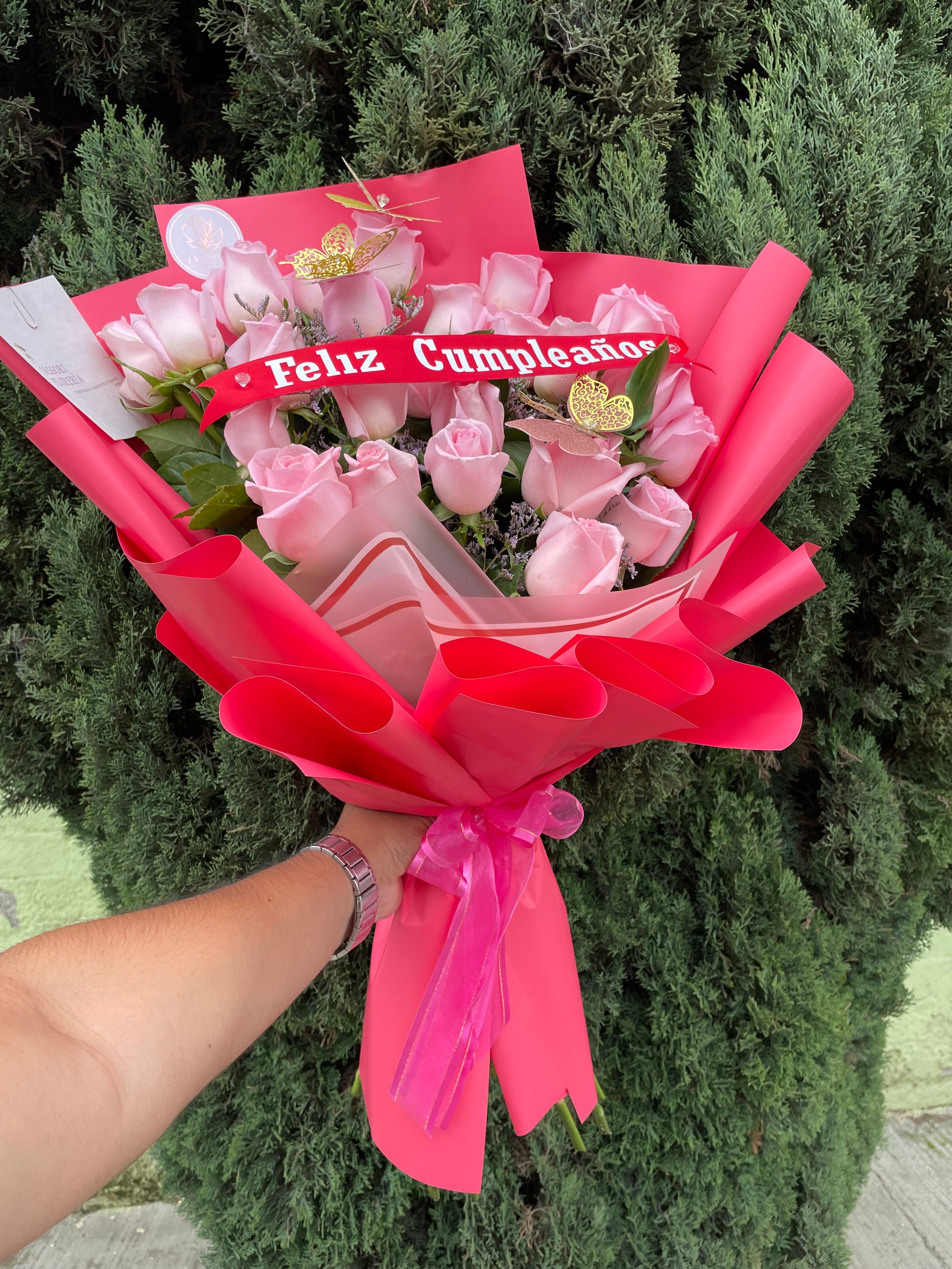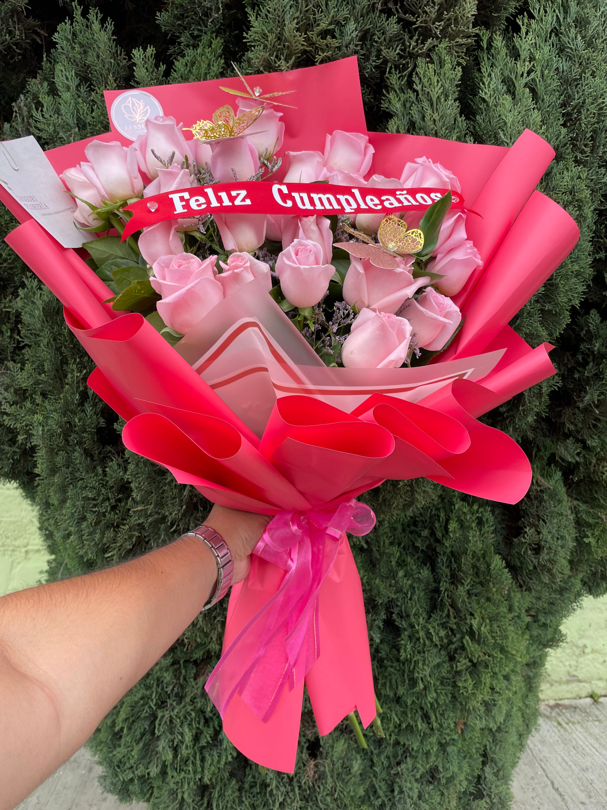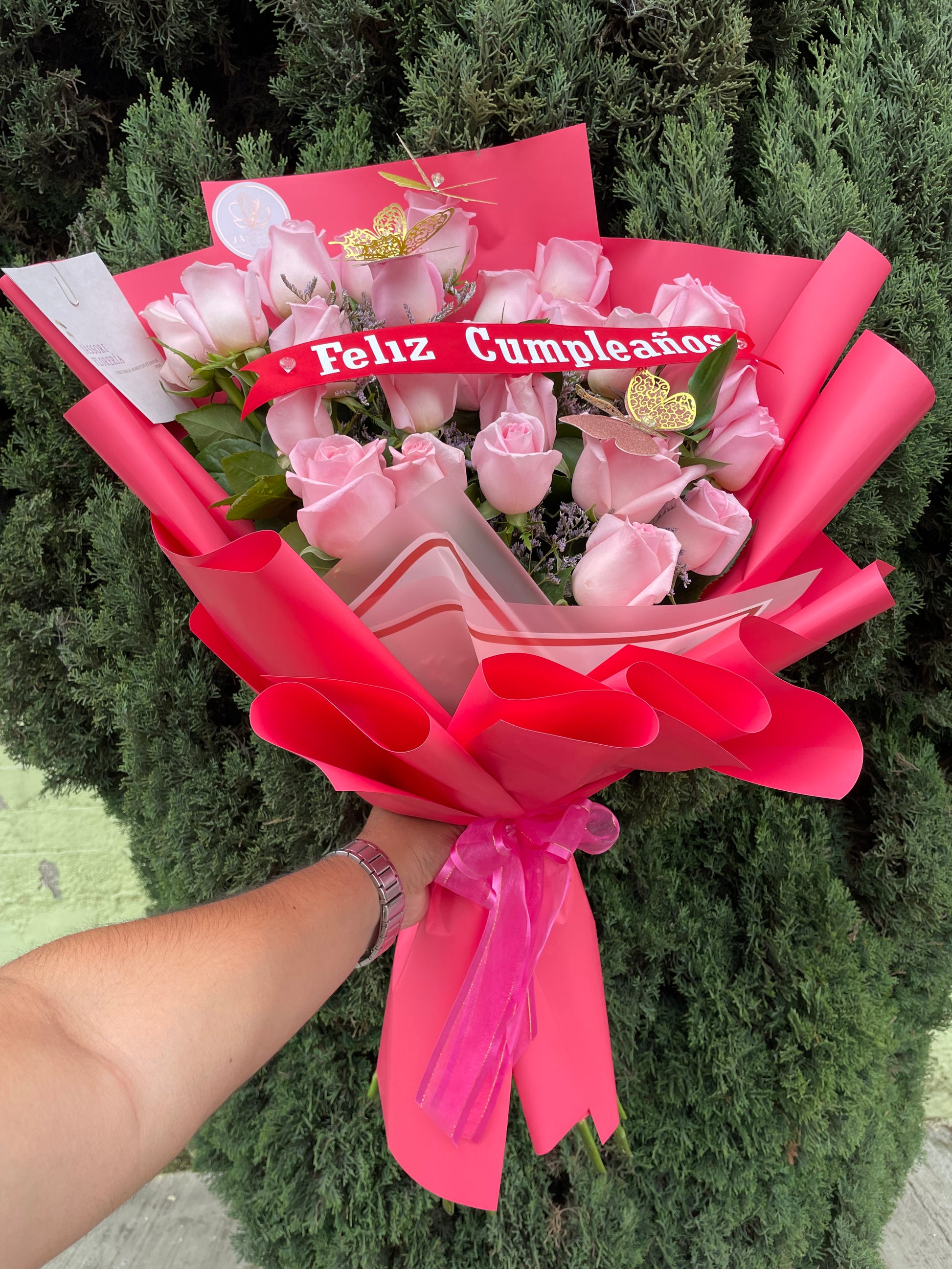 Celebra un cumpleaños con estilo y elegancia con nuestro ramo de Felicidad. 24 Rosas rosas con un foliaje fino, envueltas en papel premium y decoradas con 3 mariposas y una cinta de vinilo con el mensaje "Feliz cumpleaños". Un regalo perfecto para mostrar tu amor y cariño a esa persona especial.
