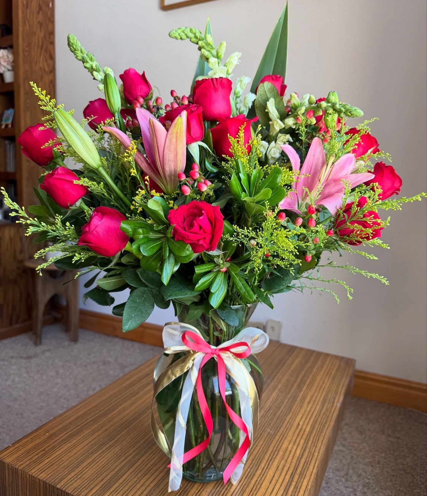 Este florero mixto contiene una hermosa combinación de flores de temporada, que incluyen rosas, lilis, astromelias y perrito. Con una variedad de colores y texturas, este arreglo es perfecto para agregar un toque de alegría y frescura a cualquier espacio. ¡Disfruta de la belleza de la naturaleza con este hermoso florero mixto!