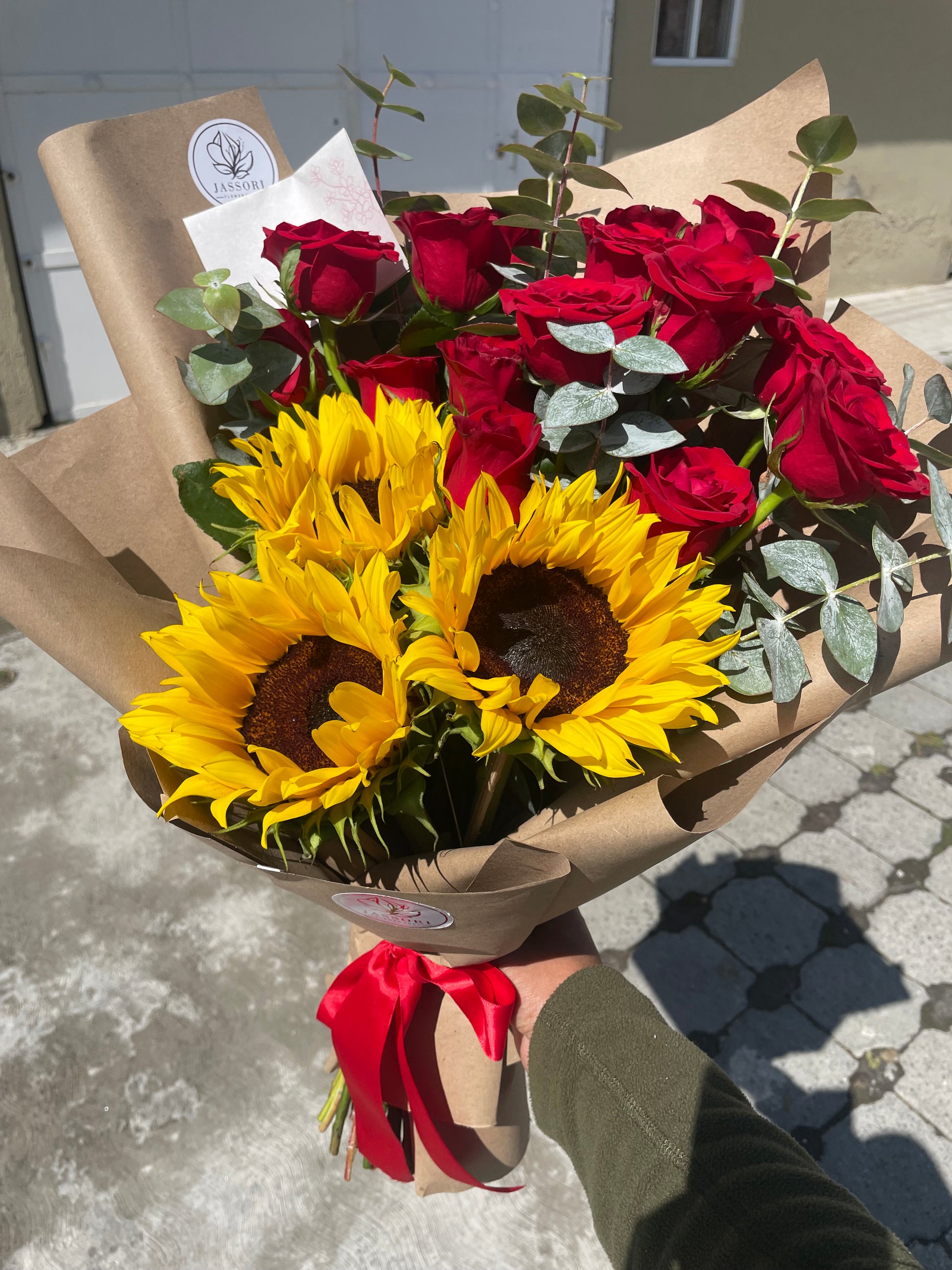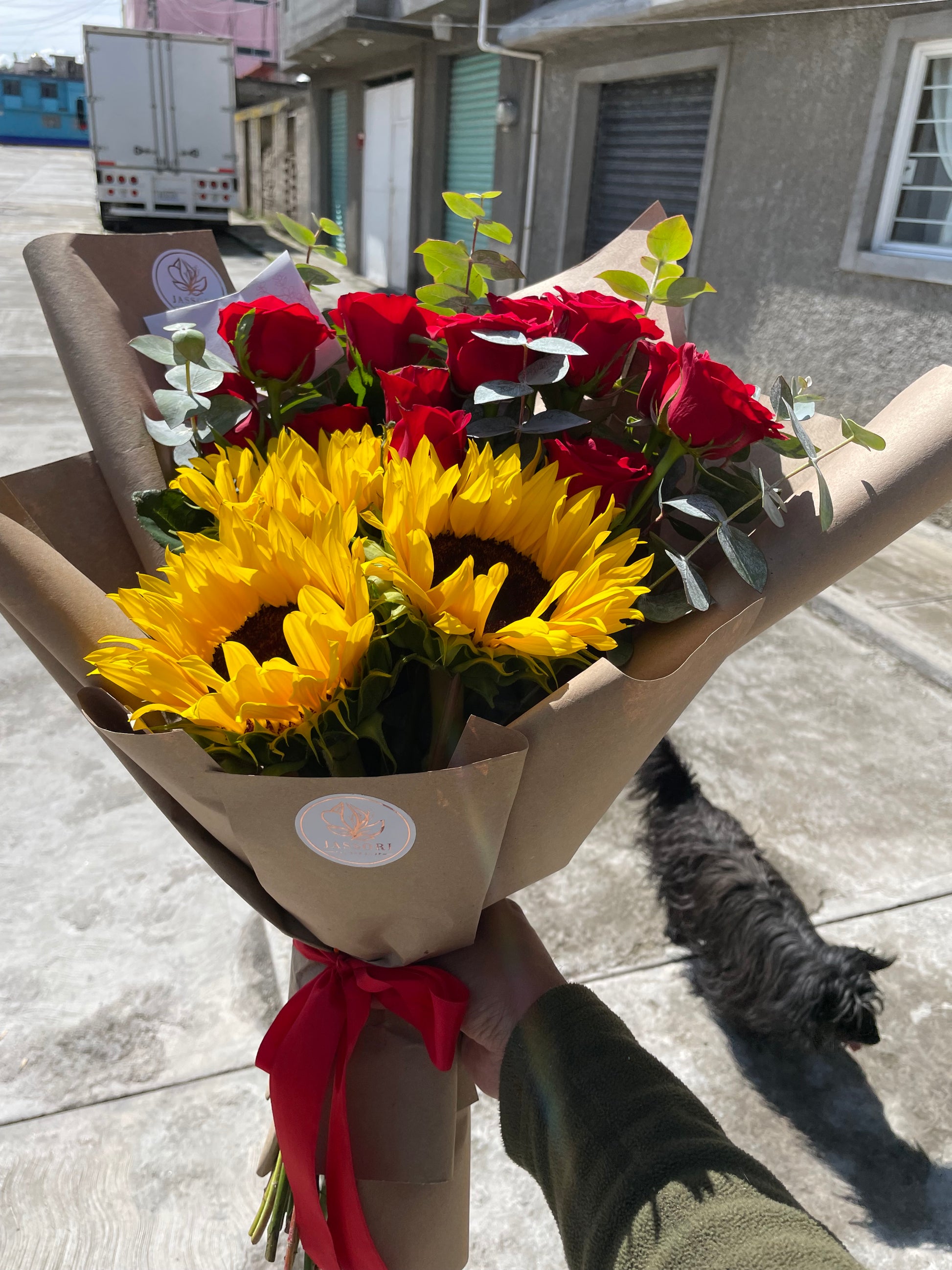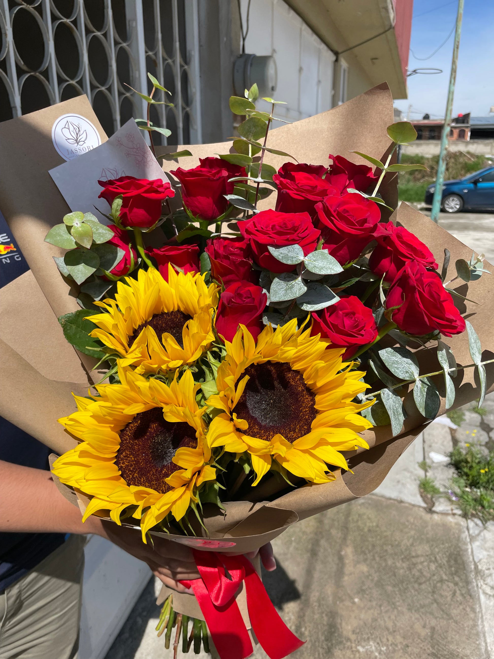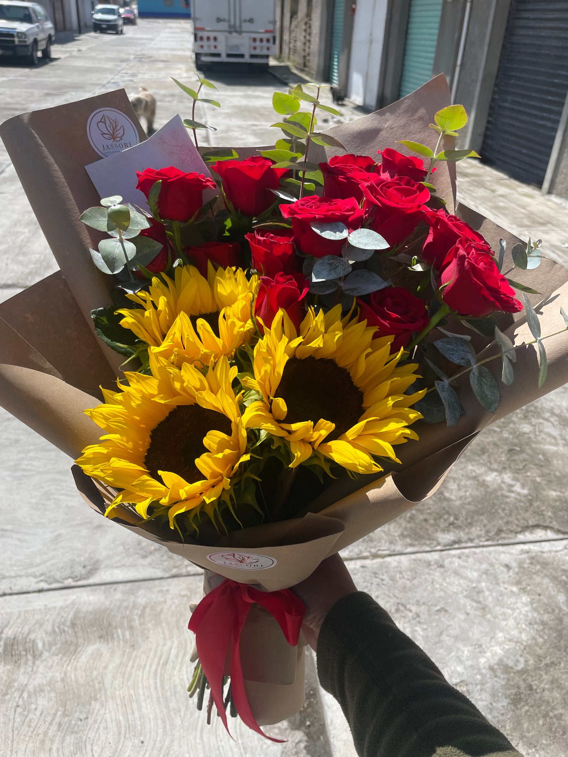 ¡Sorprende a tu ser amado con Gloria! Esta hermosa combinación de 24 rosas rojas y 3 girasoles con follaje dólar será como un abrazo lleno de amor y felicidad. El papel fino y el moño de listón satinado añaden un toque de elegancia ¡Haz que su día sea especial con Gloria!