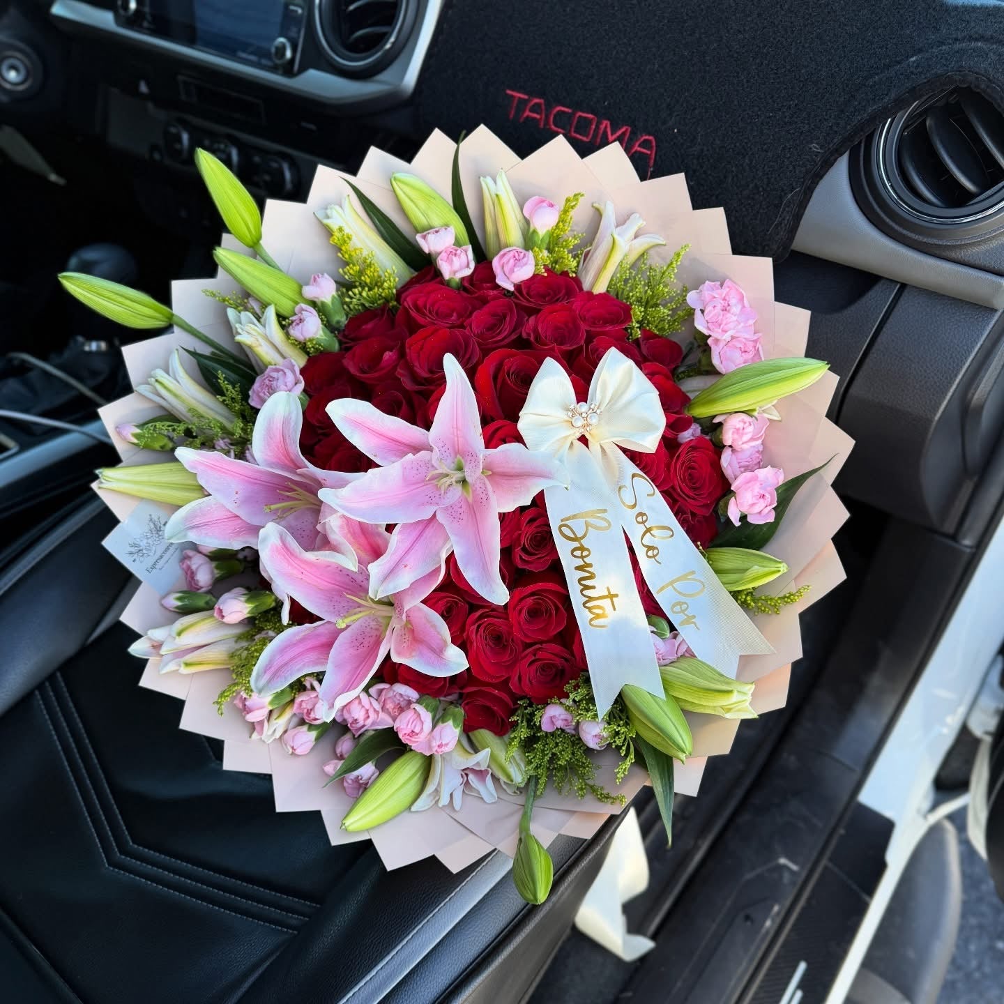 Nuestra JASSORI Especial es una hermosa combinación de 50 rosas rojas y lirios en un suave tono rosa, acompañados de delicados clavelitos y elegante papel doblado. Descubre la elegancia en cada detalle con esta variedad llamada acapulcos. Sorprende con estas flores que demuestran amor y refinamiento.