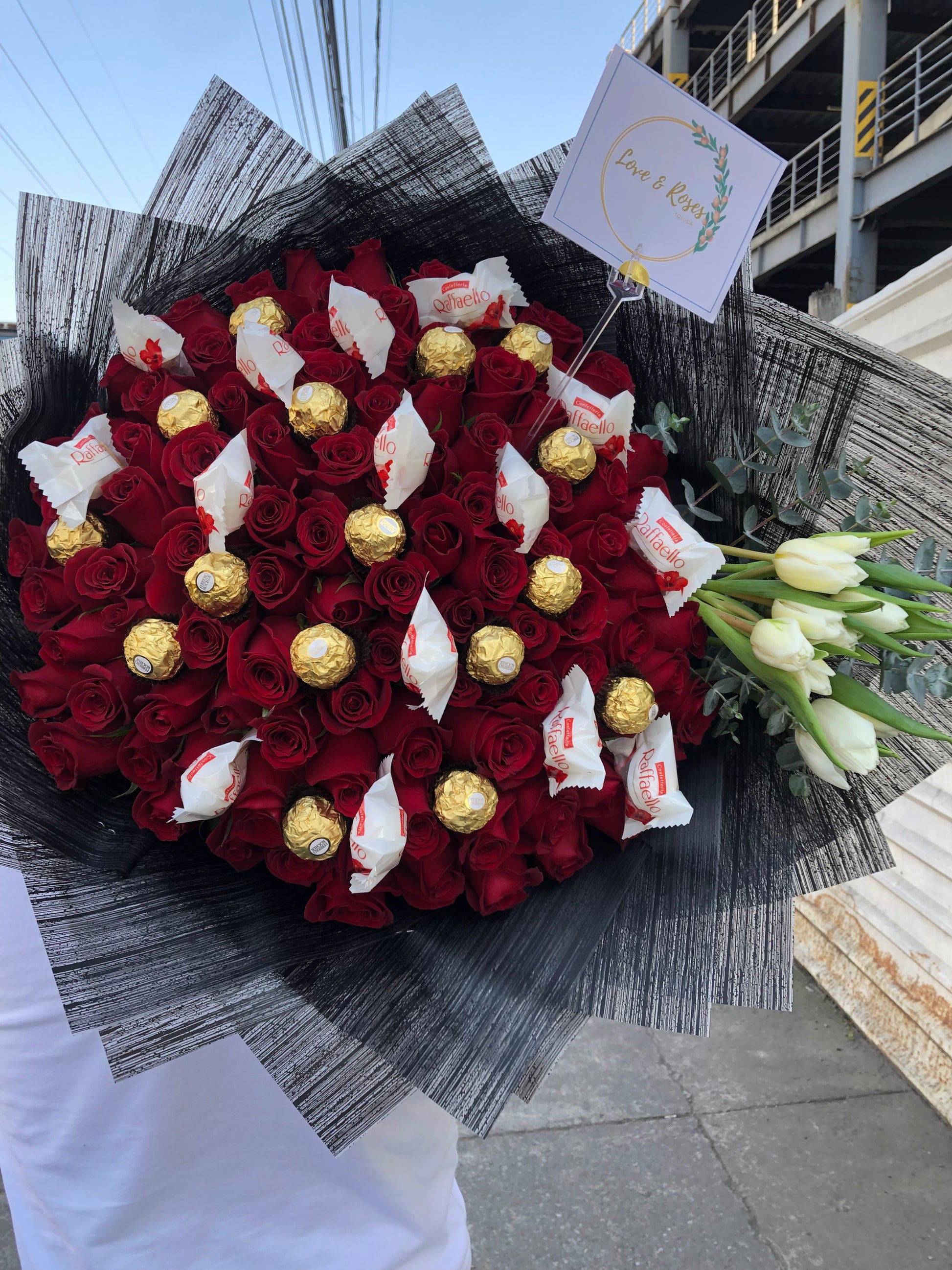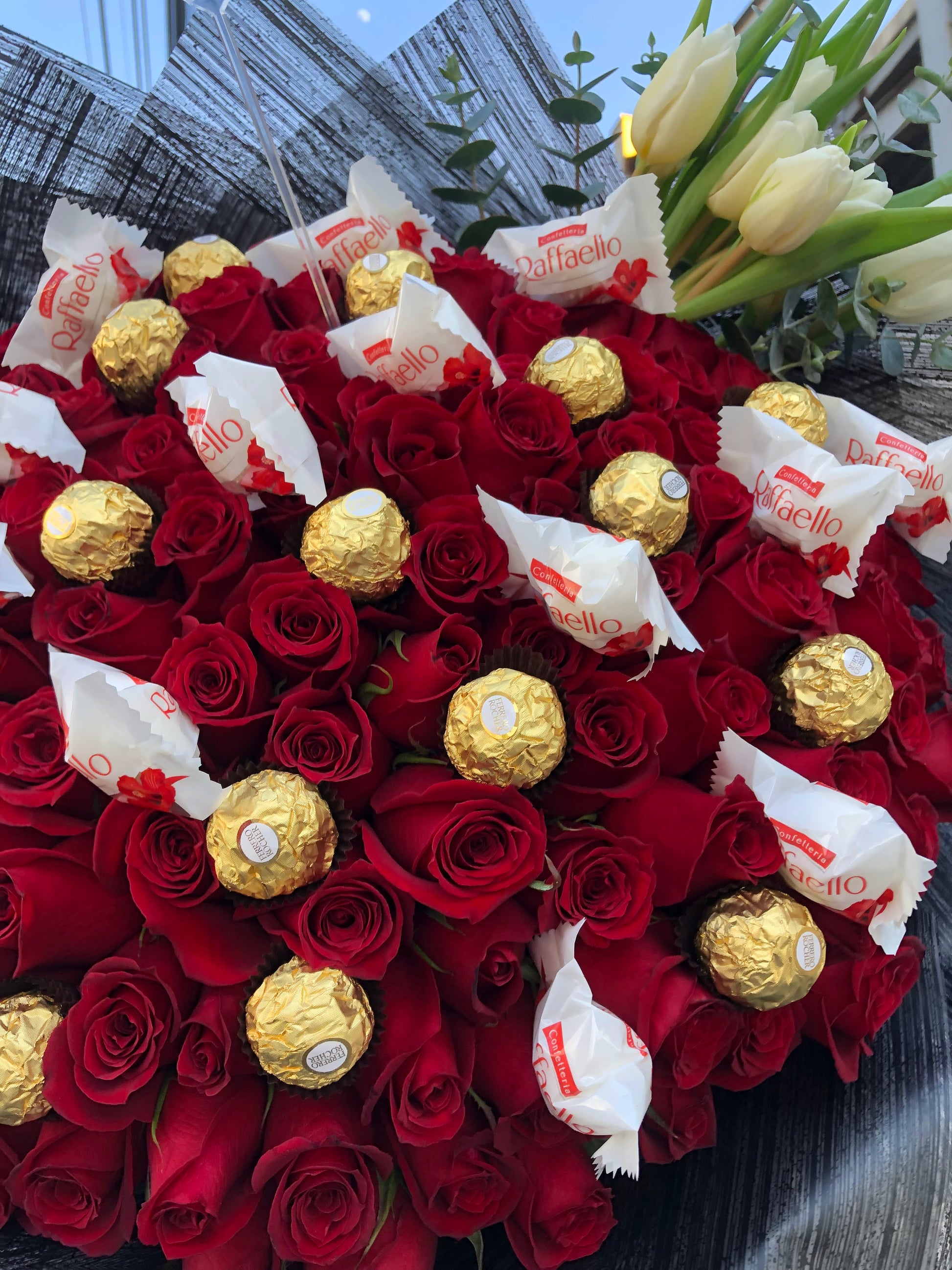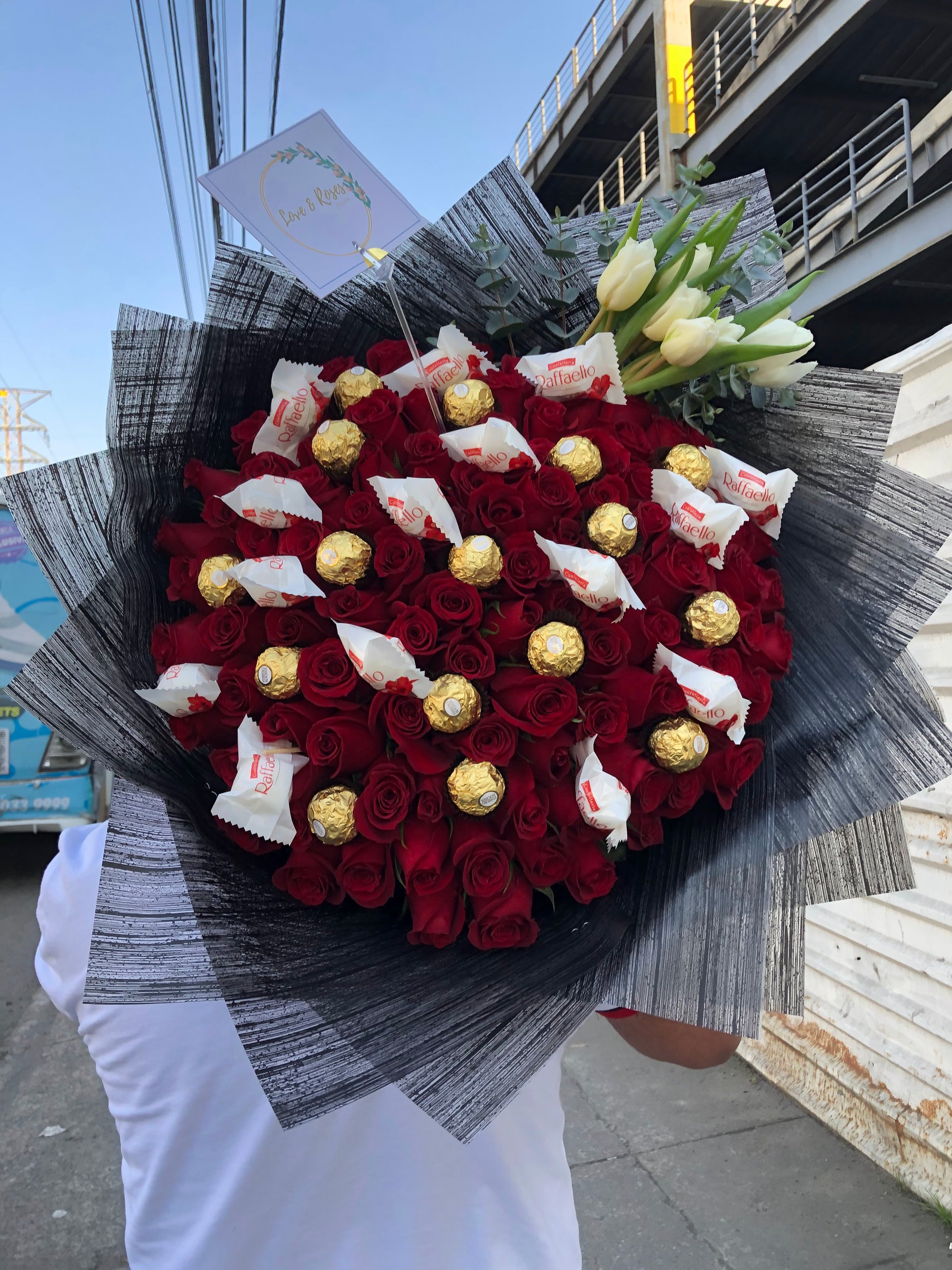 Disfruta de un latido de dulzura y amor con Latido Rojo Chocolate. Esta cautivadora caja incluye 100 bellas rosas rojas y 10 elegantes tulipanes blancos, acompañados de 24 deliciosos chocolates Ferrero y 24 exquisitos Rafaello envueltos en papel fino y atados con un lazo de listón. Una experiencia de lujo para los sentidos que demuestra tu amor de la manera más sofisticada y exclusiva.