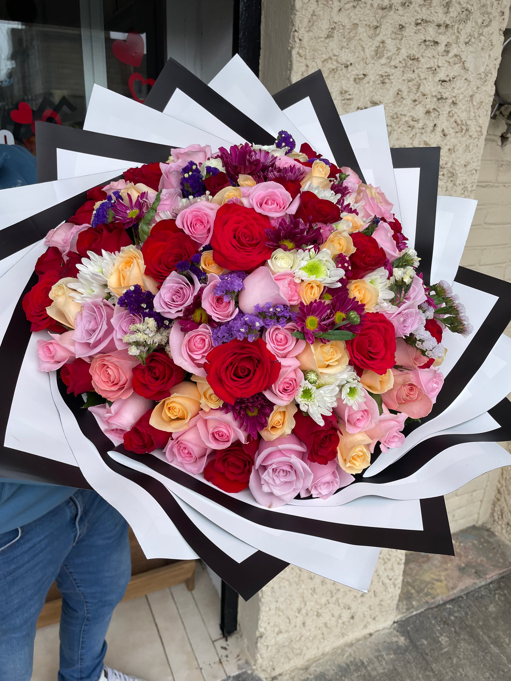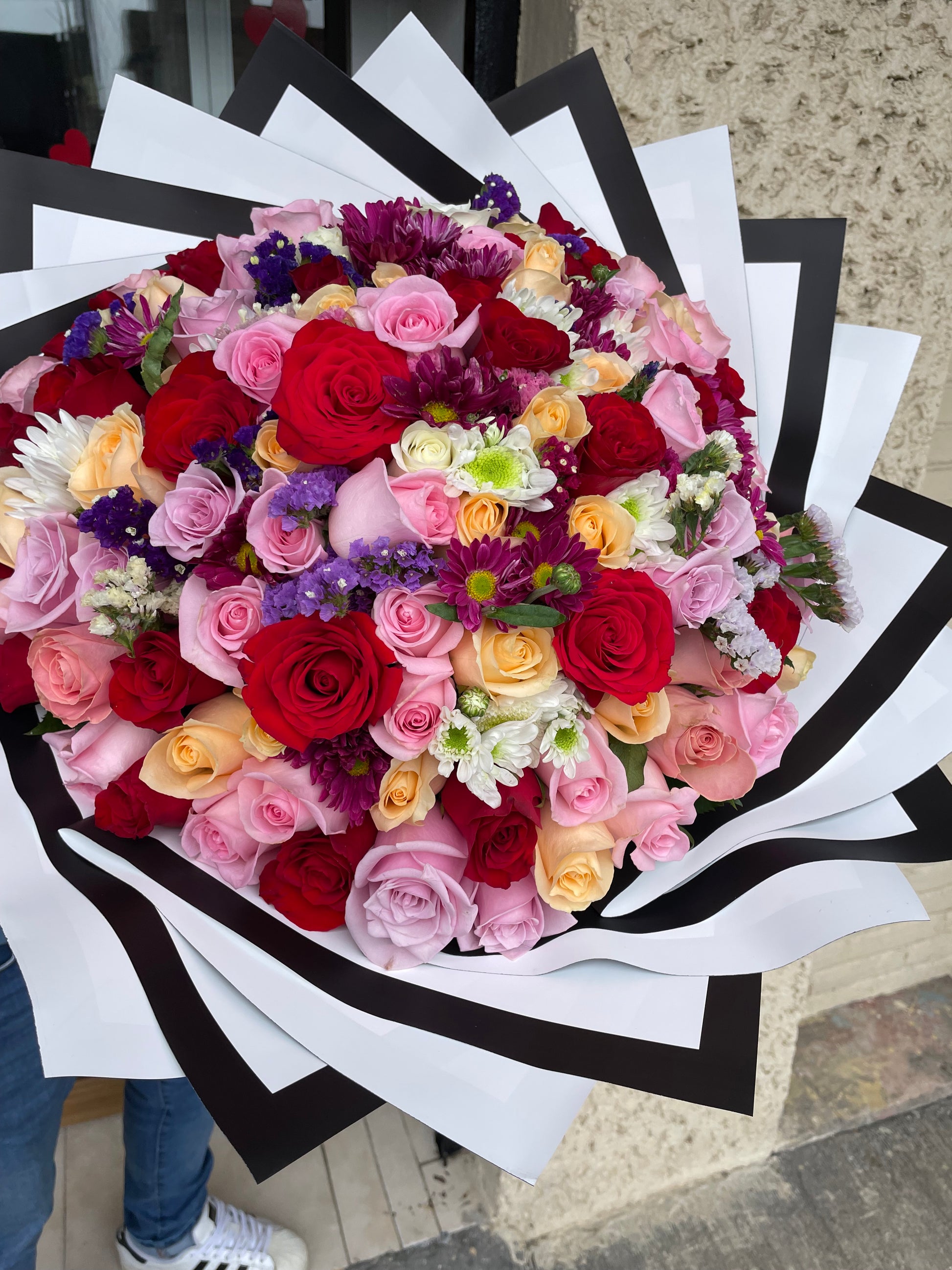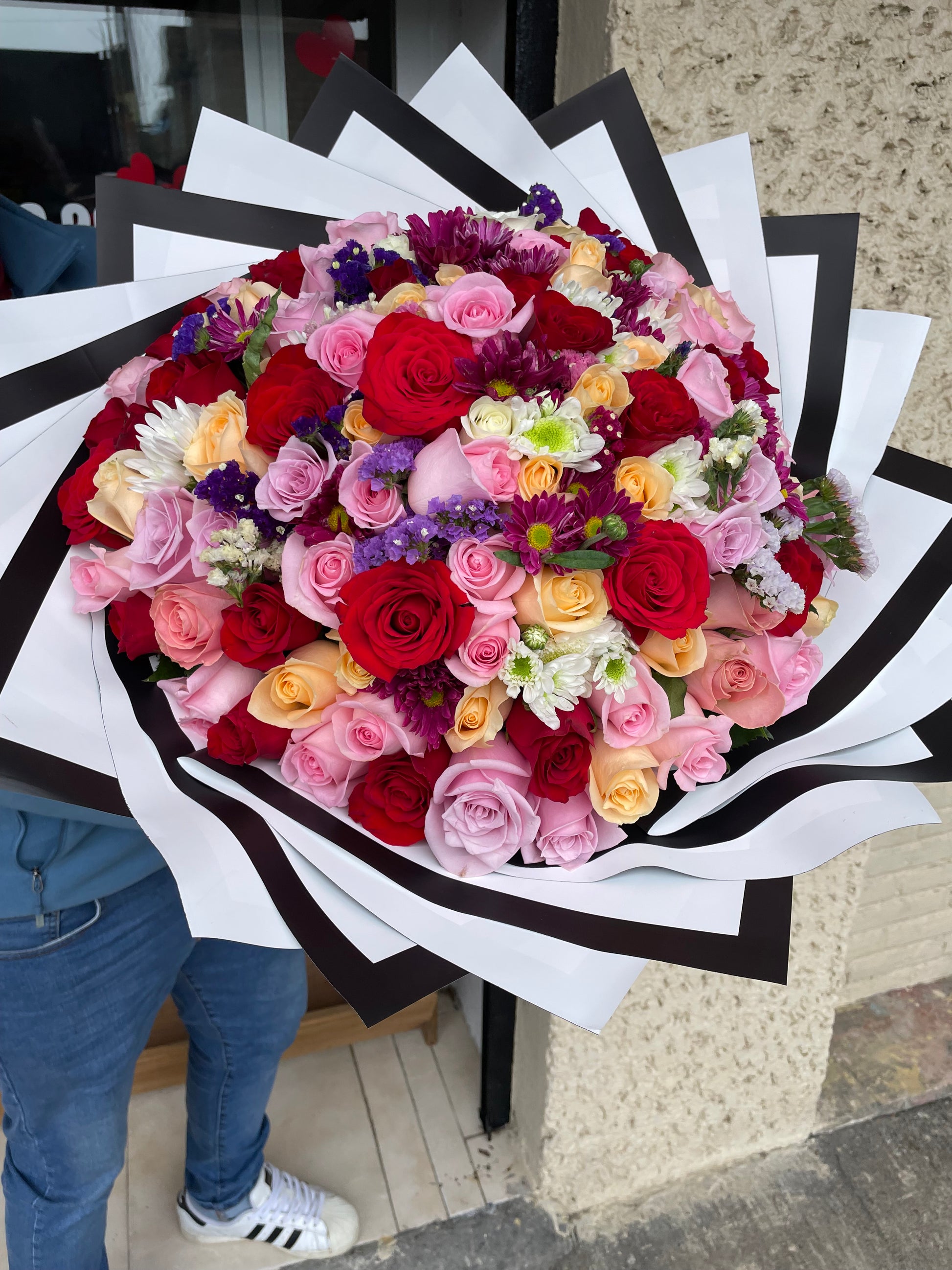 Mia es un ramo atrevido que reúne 100 rosas multicolores junto con flores de temporada cuidadosamente seleccionadas. Envuelto en papel coreano de textura única y adornado con un moño satinado, este arreglo vibrante y sofisticado es perfecto para quienes buscan impresionar con un toque de audacia y elegancia.