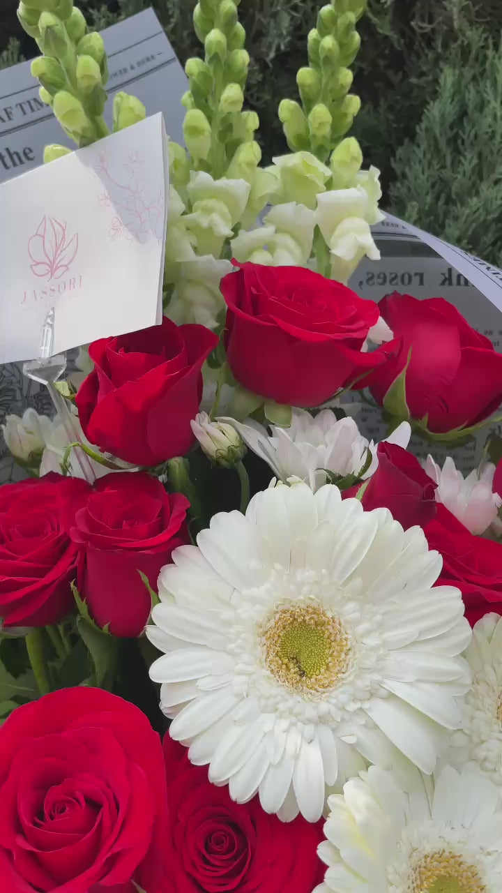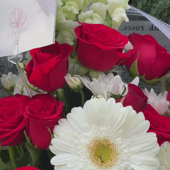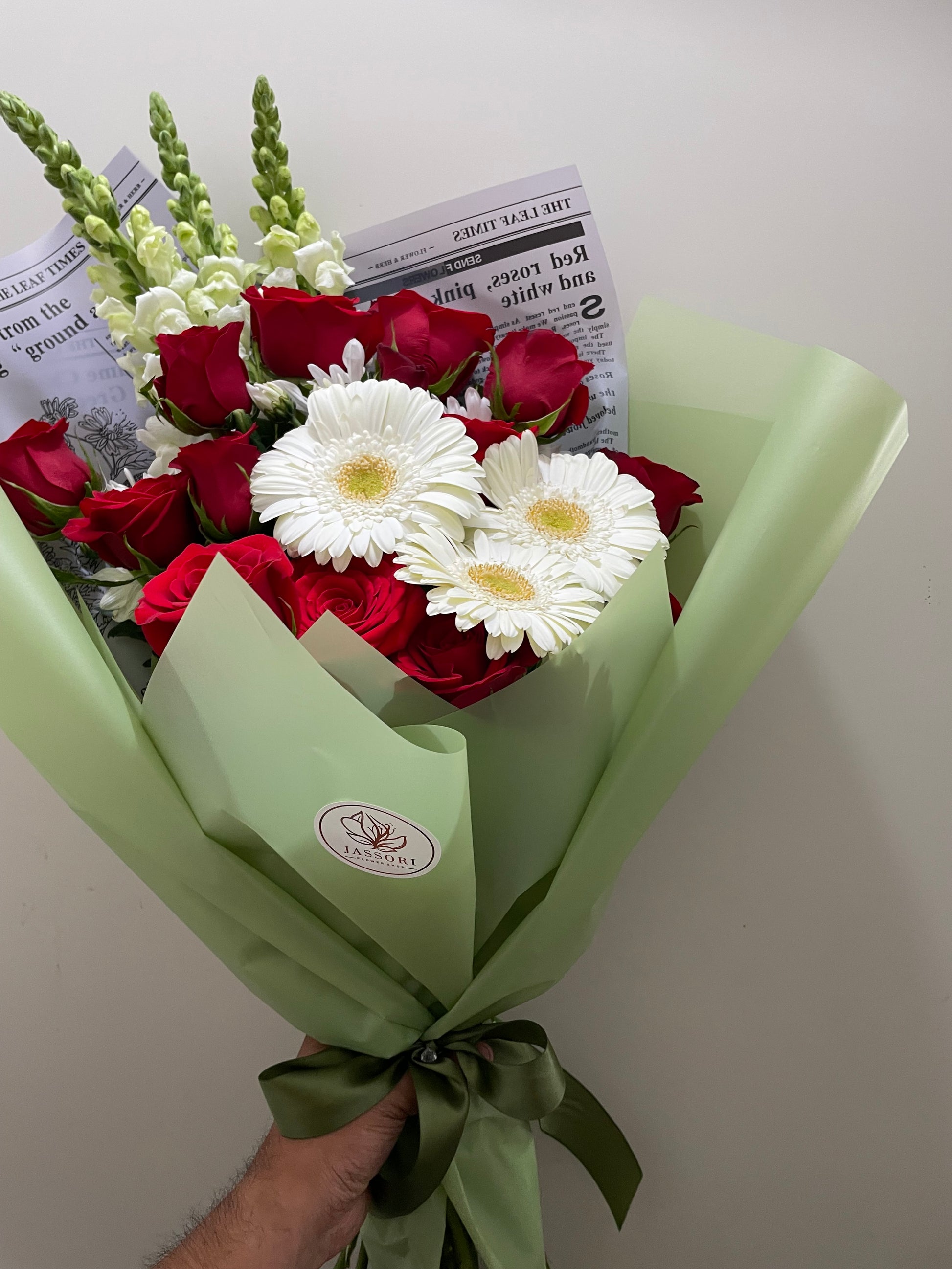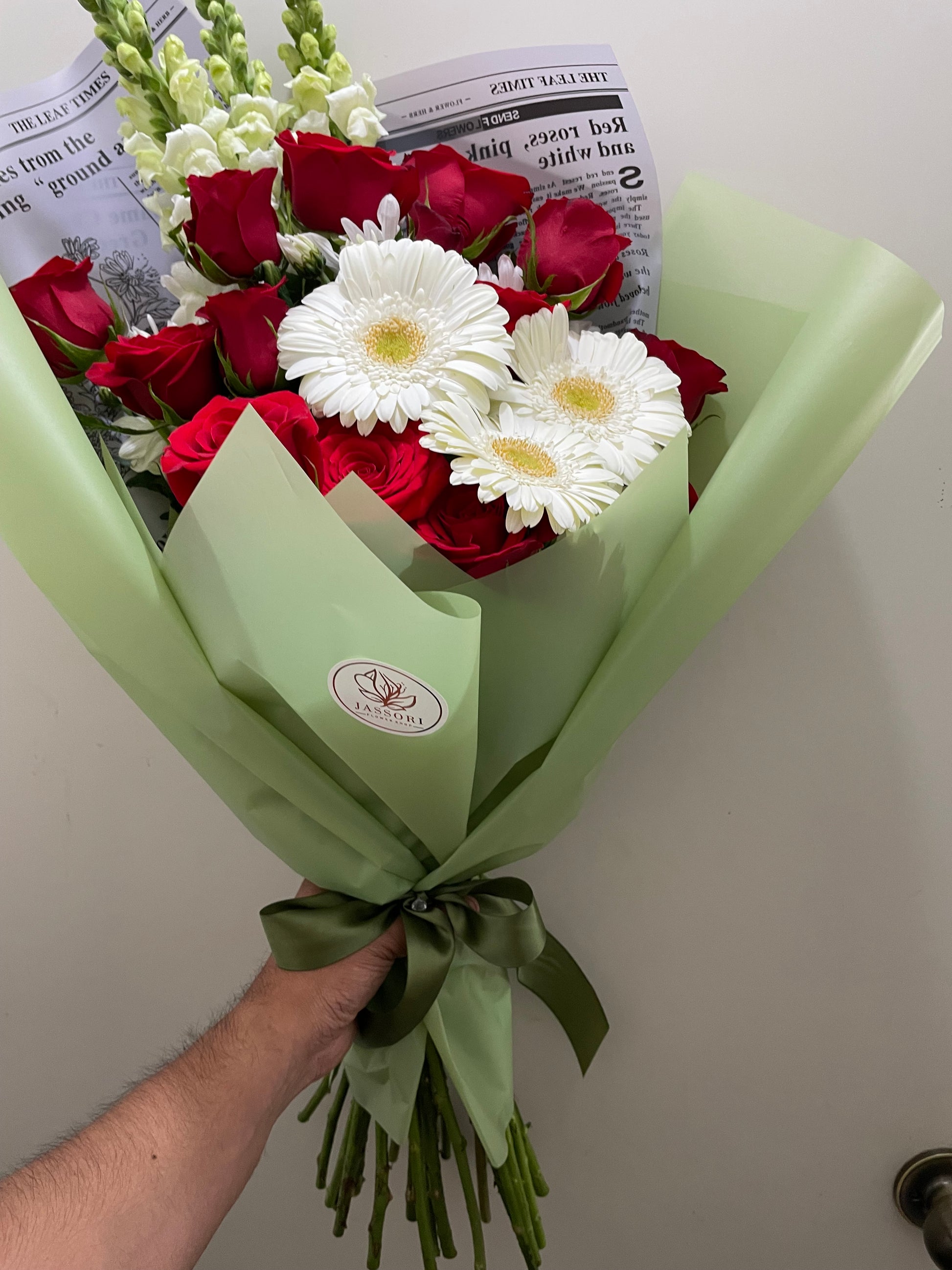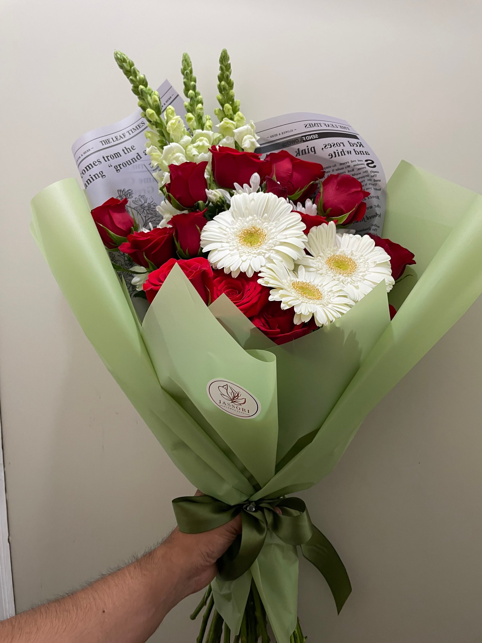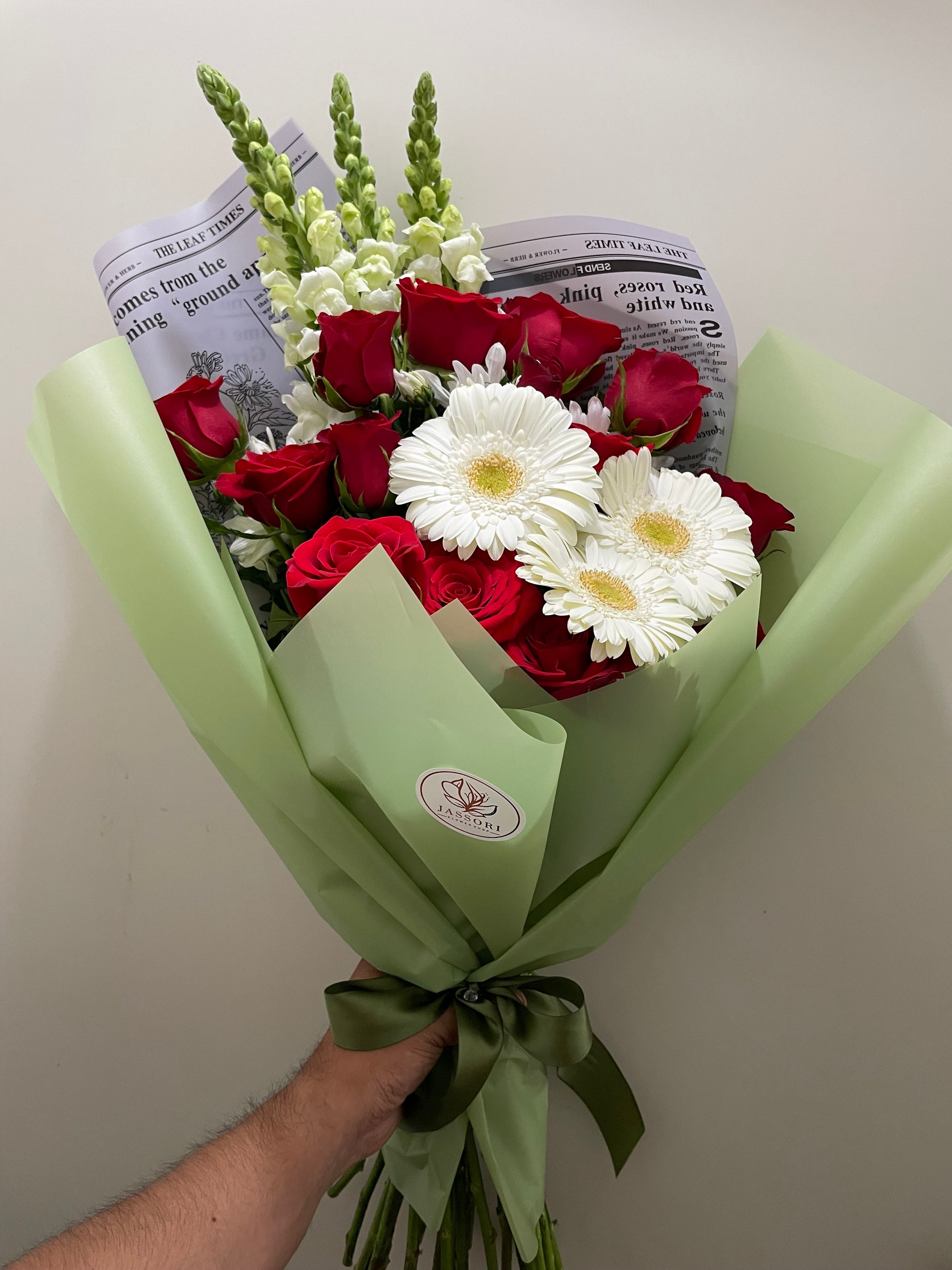 Esta hermosa combinación de un ramo de 12 rosas y 3 gerberas blancas junto con flores perrito y follaje fino, es el regalo perfecto para expresar amor y admiración. Hecho con papel premium, esta mezcla de flores frescas seguramente impresionará a cualquier persona afortunada de recibirla.