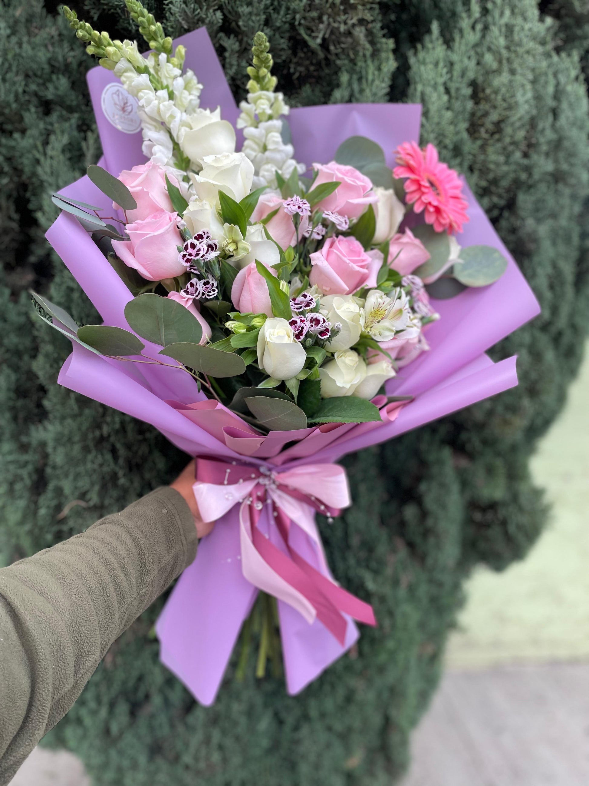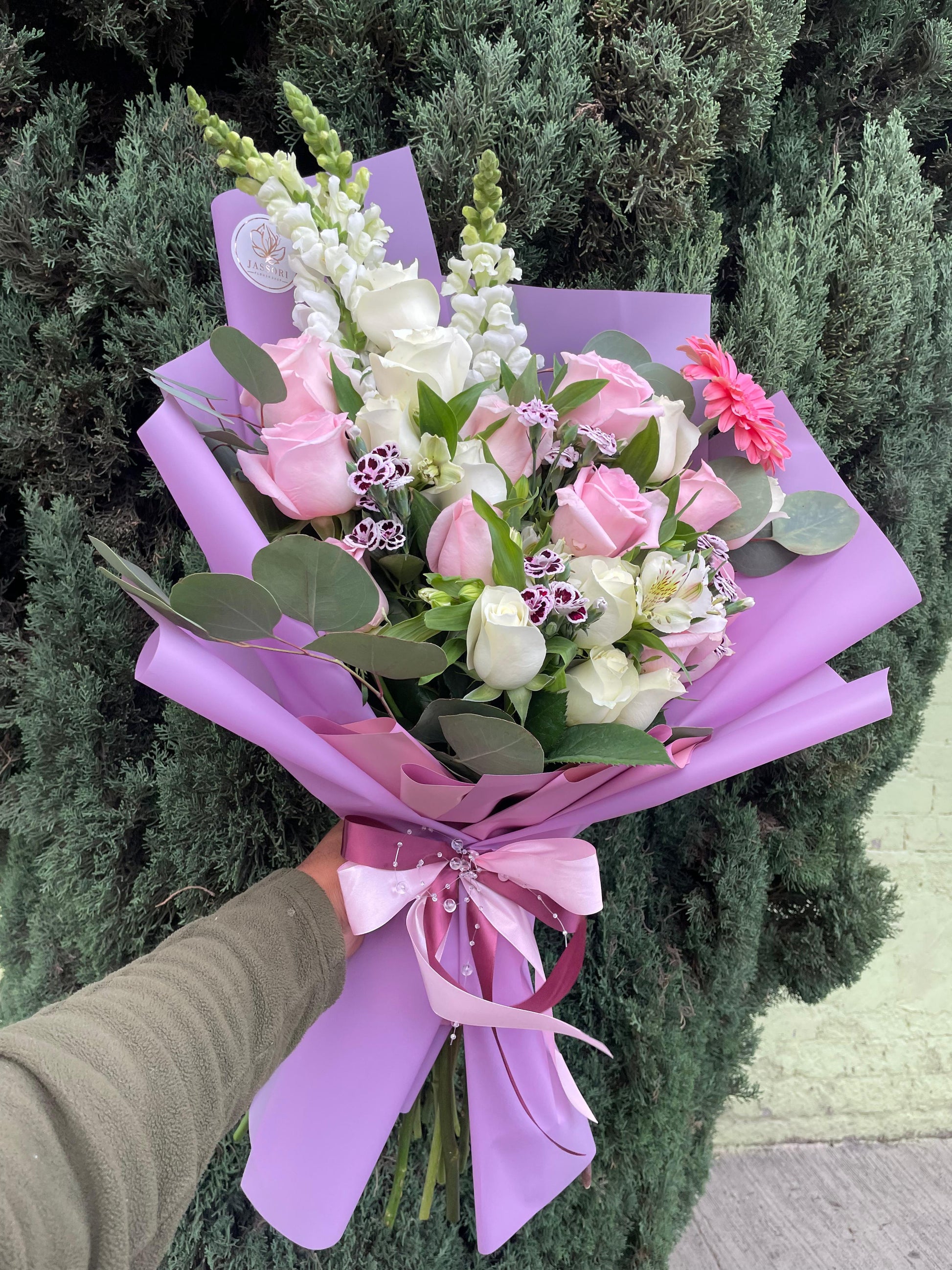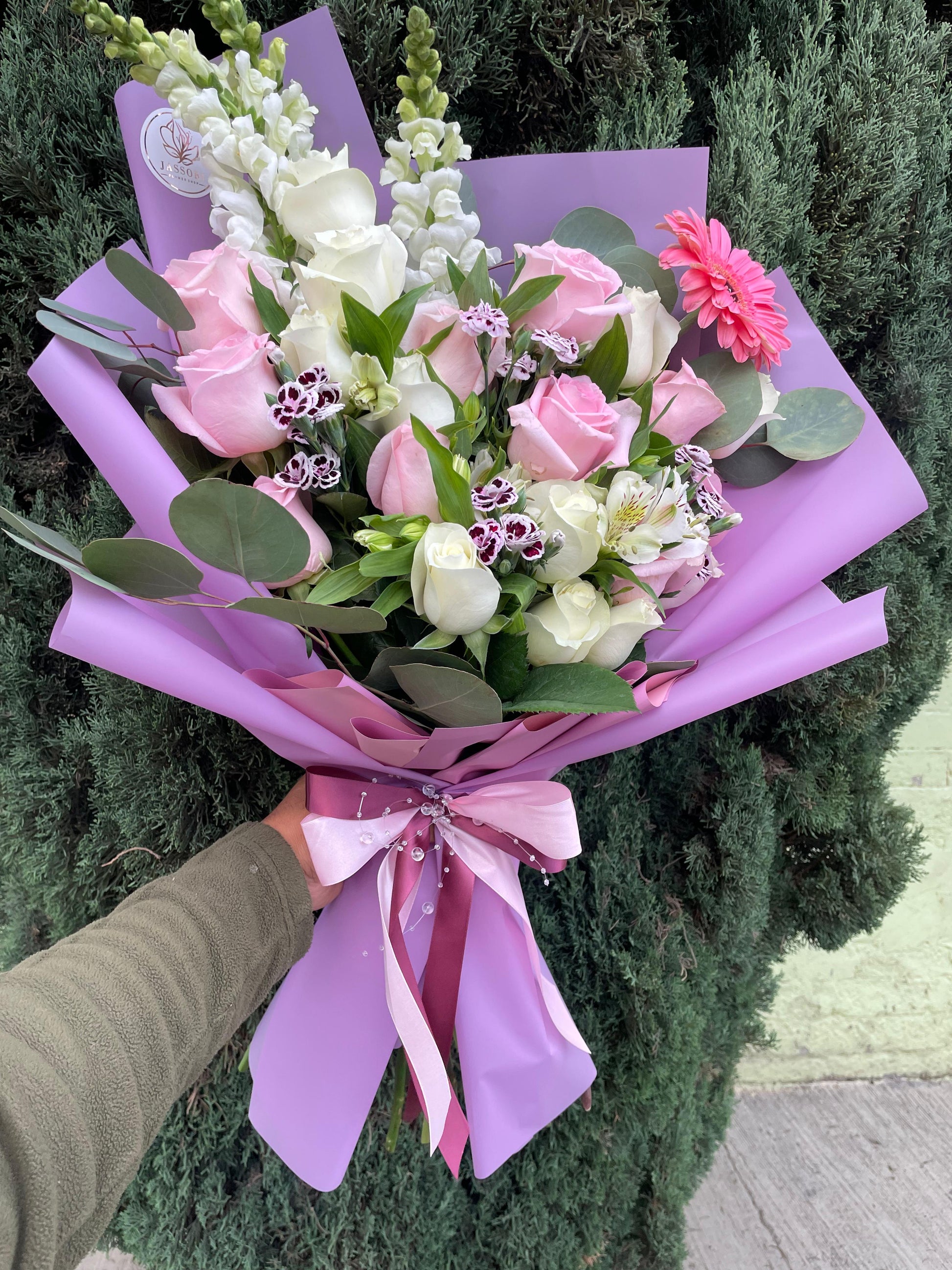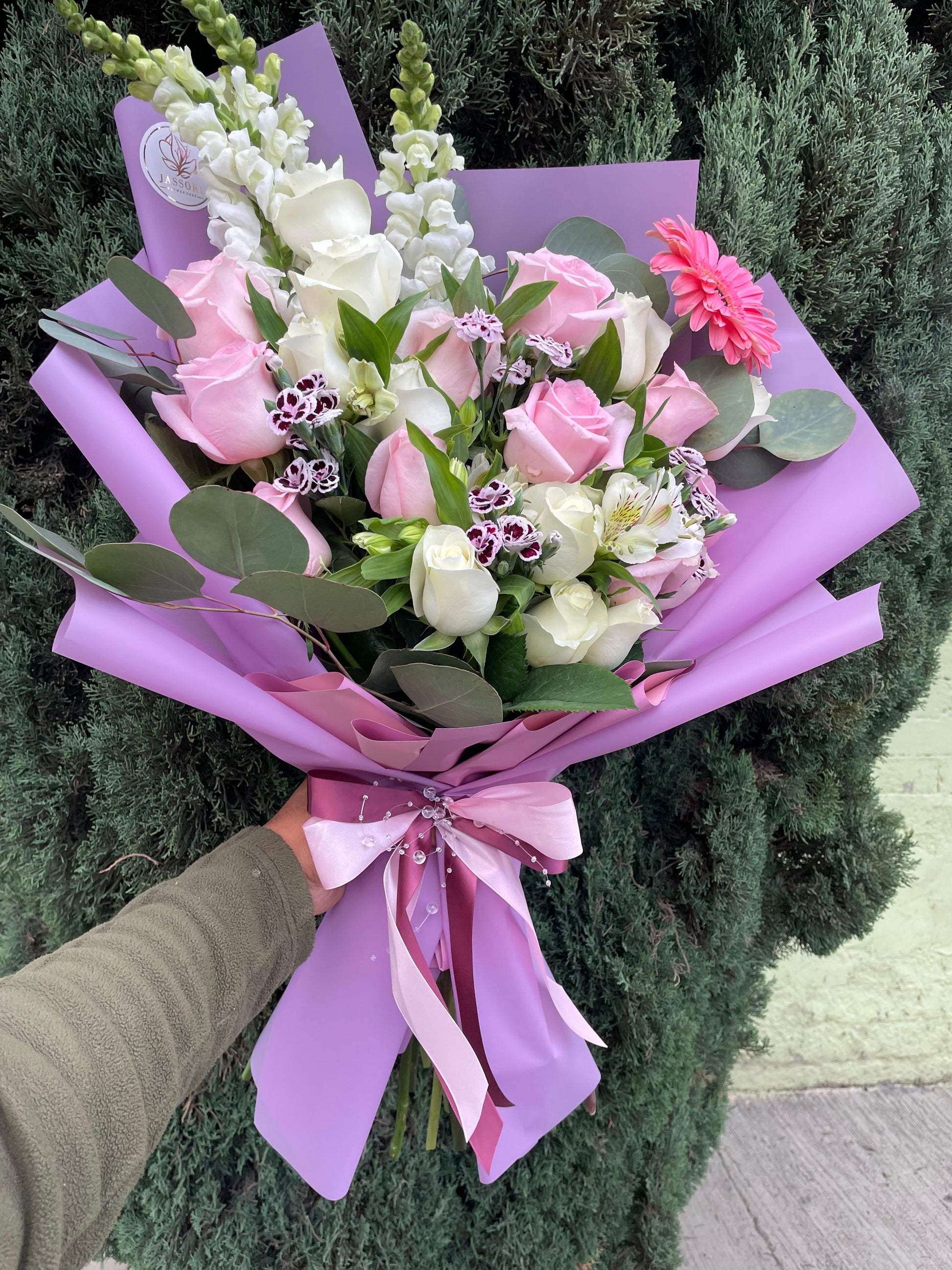 Exquisito arreglo floral que combina delicadas rosas en tonos lila y blanco, complementadas con follaje fino y una distinguida gerbera rosa pastel como elemento focal. Presentado con elegancia en papel fino y finalizado con un refinado moño de listón, NADIA es una expresión sublime de sofisticación y belleza natural, perfecta para ocasiones que merecen un toque de distinción.