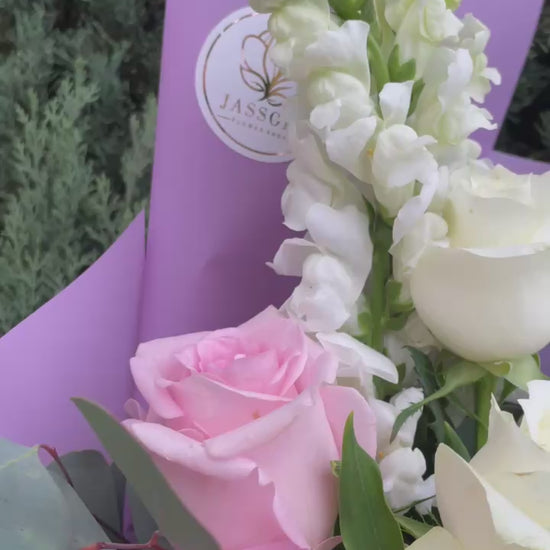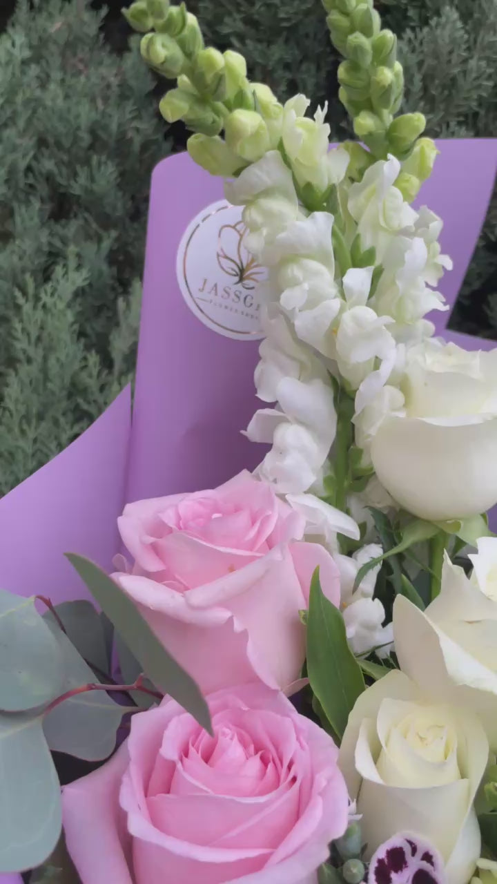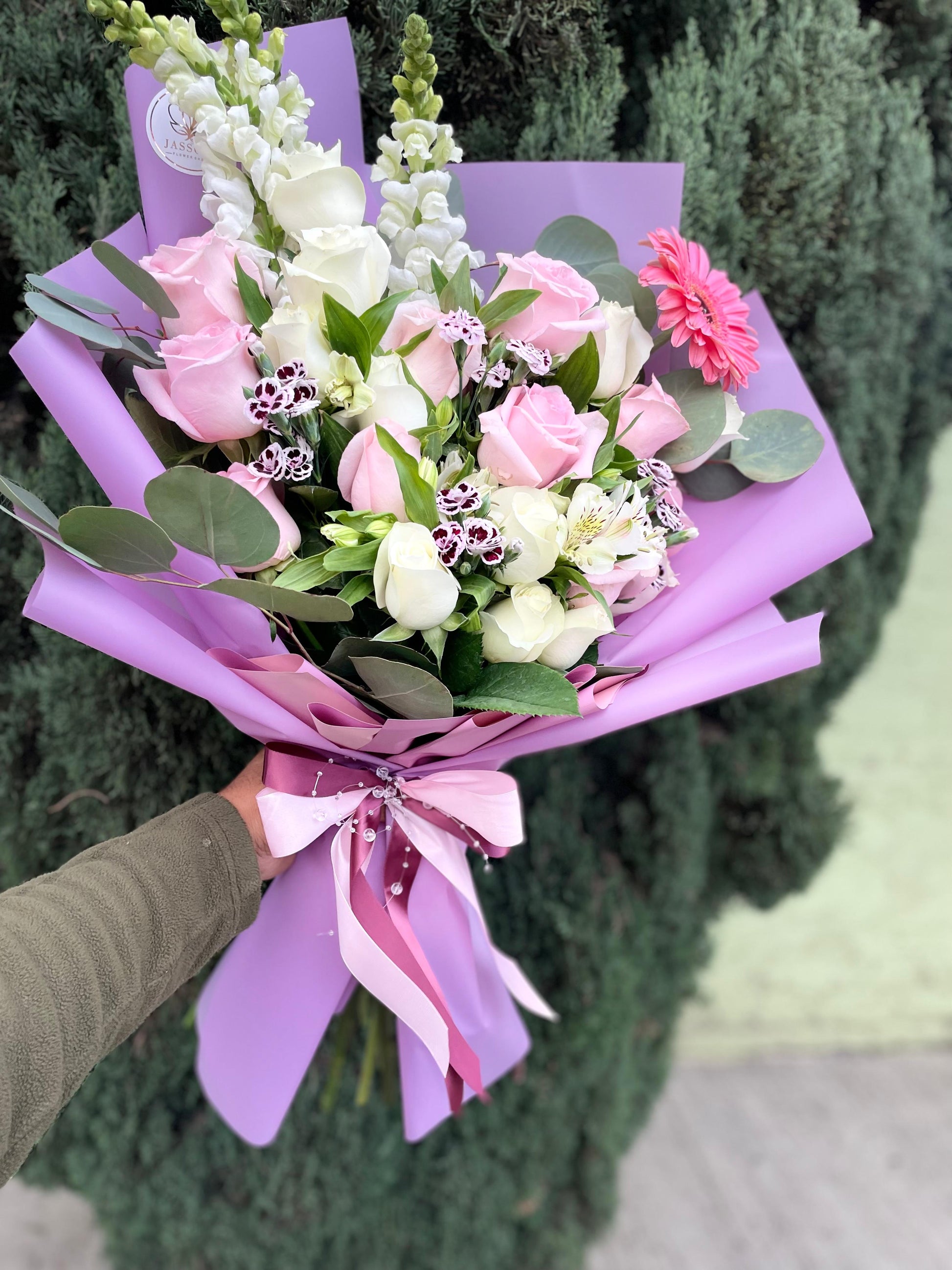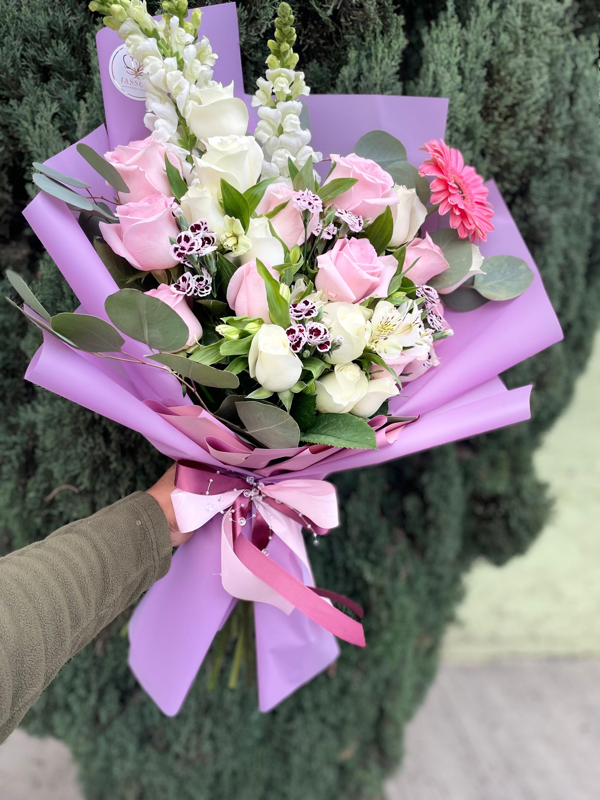 Exquisito arreglo floral que combina delicadas rosas en tonos lila y blanco, complementadas con follaje fino y una distinguida gerbera rosa pastel como elemento focal. Presentado con elegancia en papel fino y finalizado con un refinado moño de listón, NADIA es una expresión sublime de sofisticación y belleza natural, perfecta para ocasiones que merecen un toque de distinción.