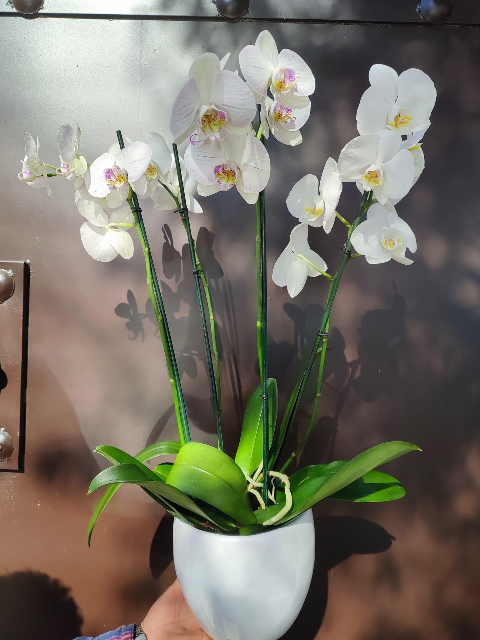 Experimente la belleza y elegancia de la naturaleza con Orquídea 4. Esta planta cuenta con dos orquídeas dobles en una maceta de cerámica, agregando un toque de lujo y sofisticación a cualquier espacio. Disfrute de su exquisita fragancia y admire su belleza única, perfecta para cualquier amante de la naturaleza y el lujo.