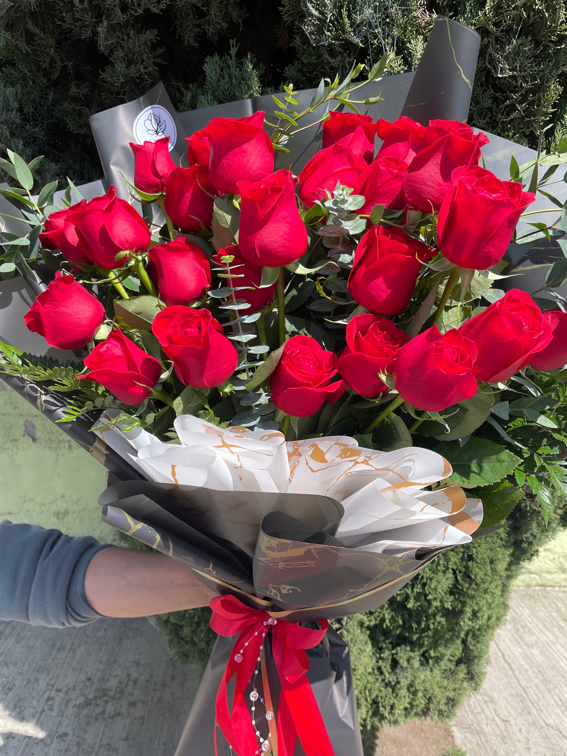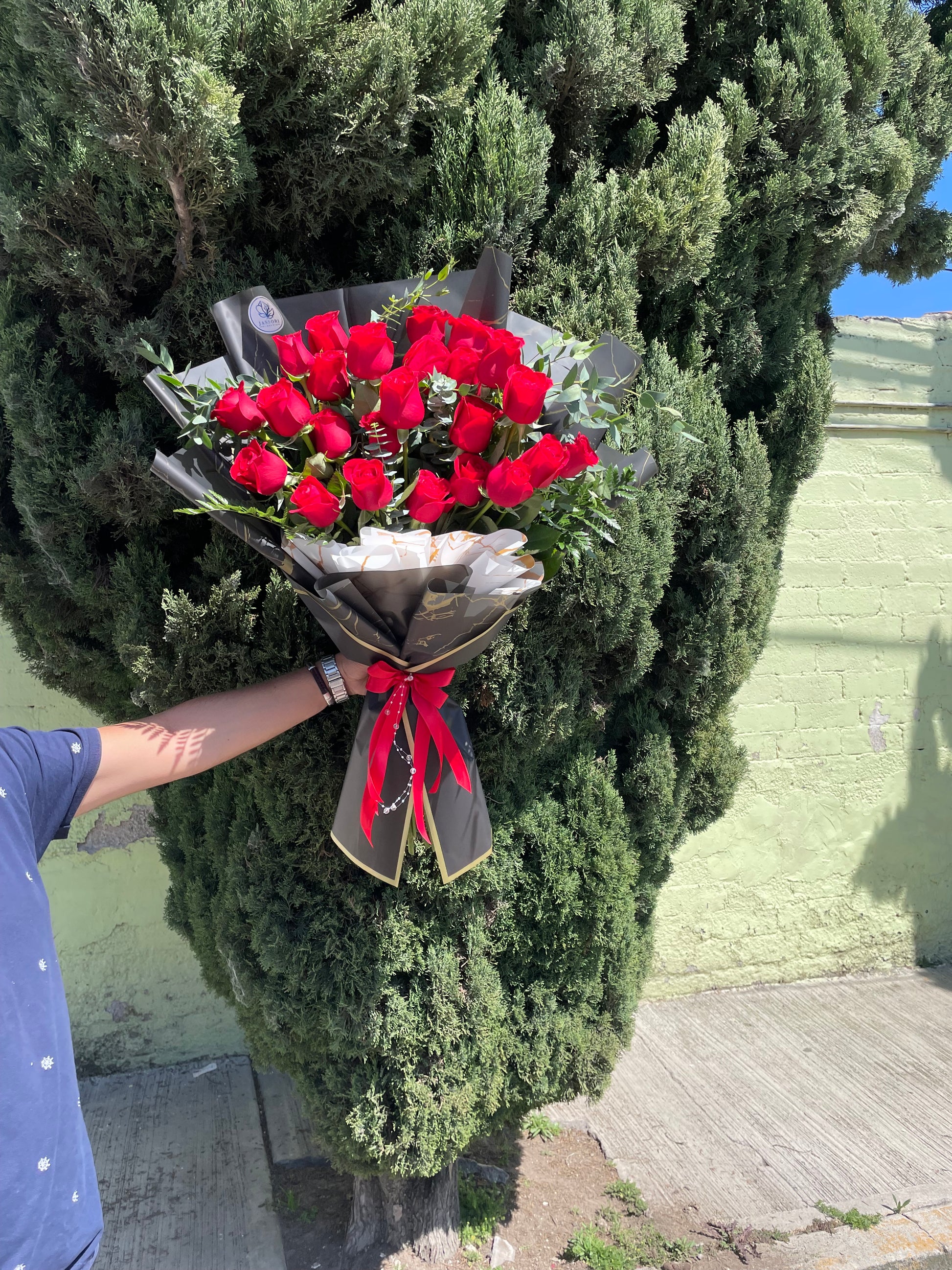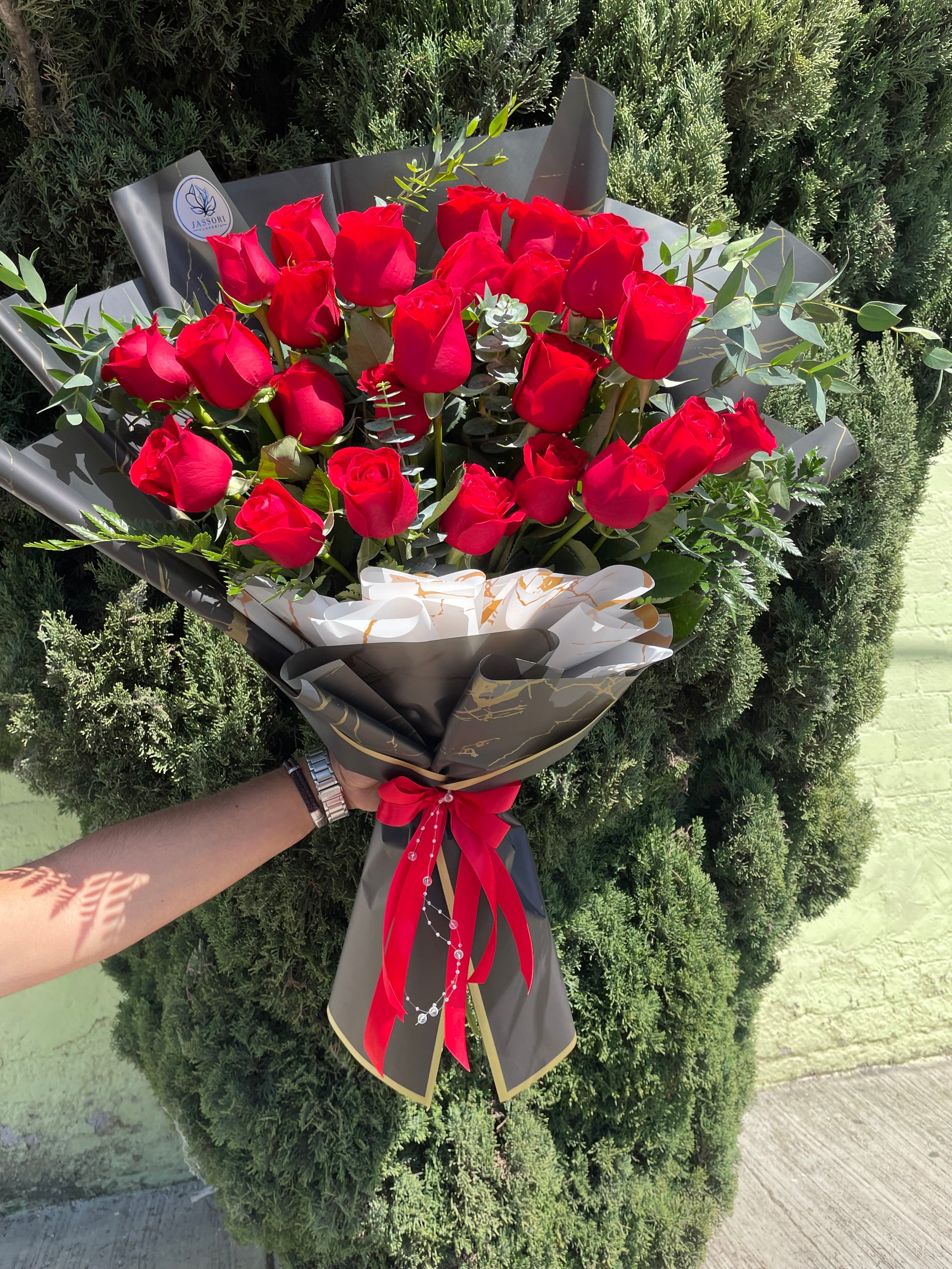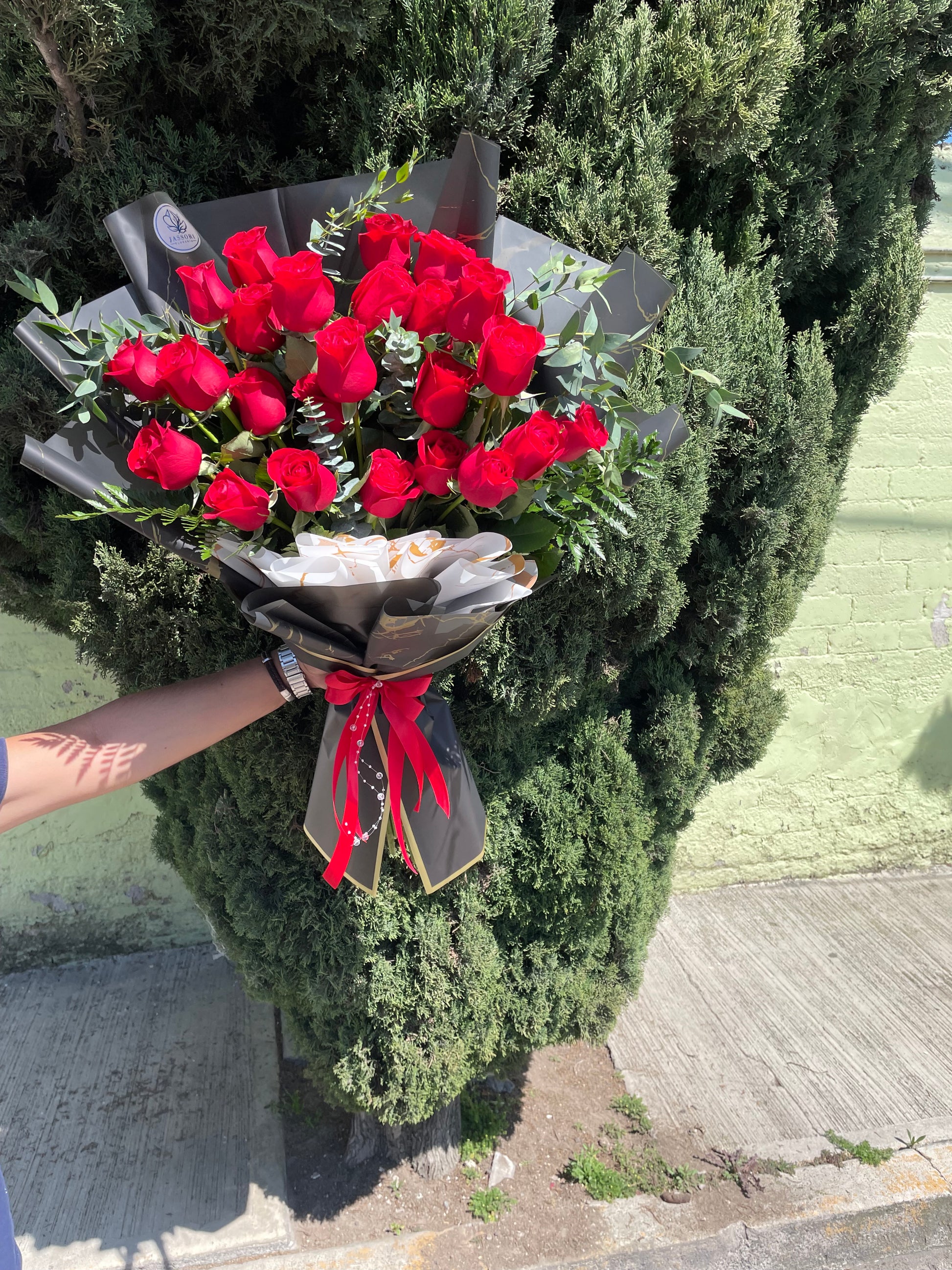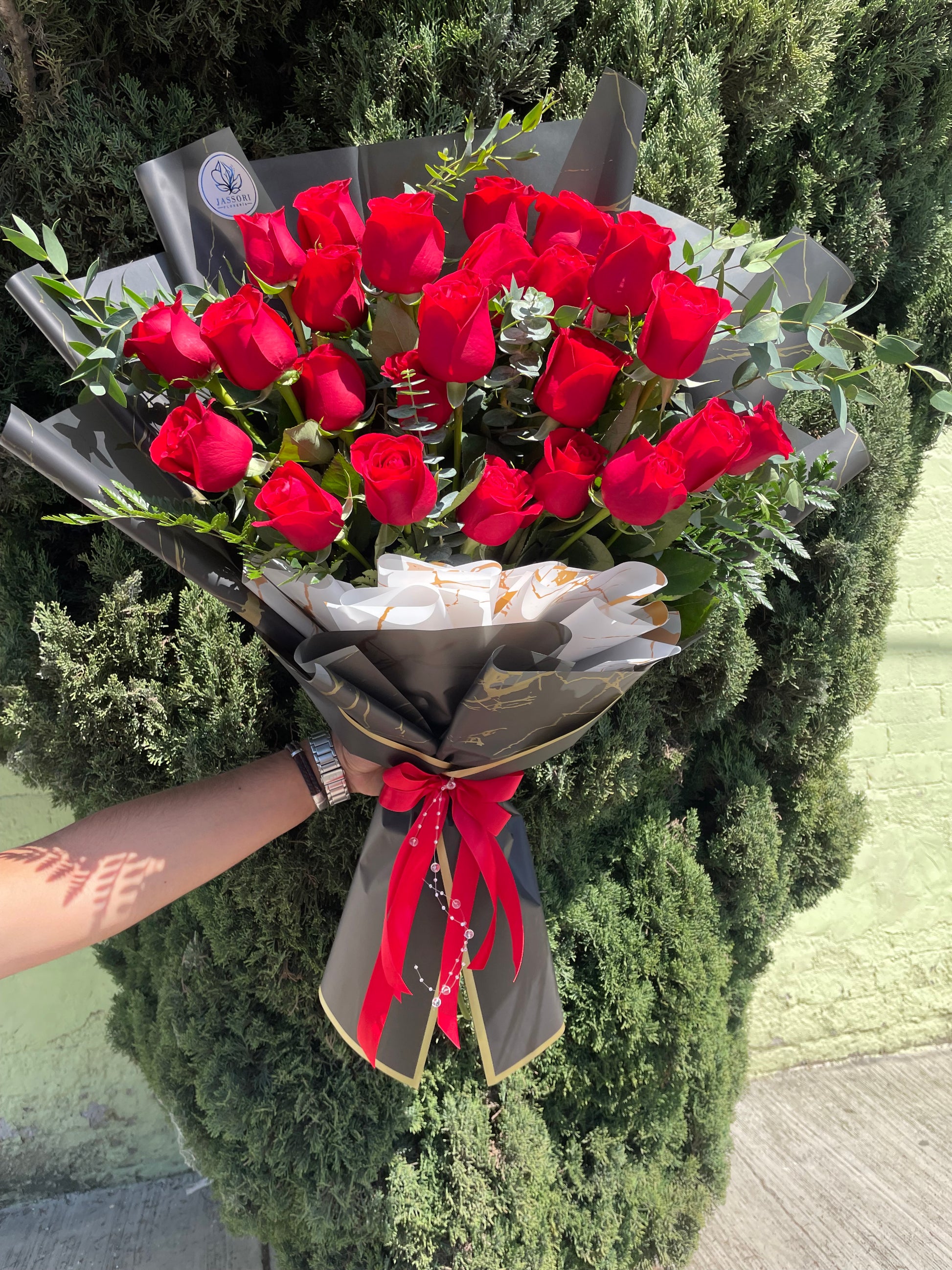 Este elegante ramo de flores cuenta con 24 rosas rojas de estilo moderno, acompañadas de un delicado follaje. Perfecto para expresar amor y admiración. Hecho con materiales de alta calidad para garantizar una presentación impecable y duradera.