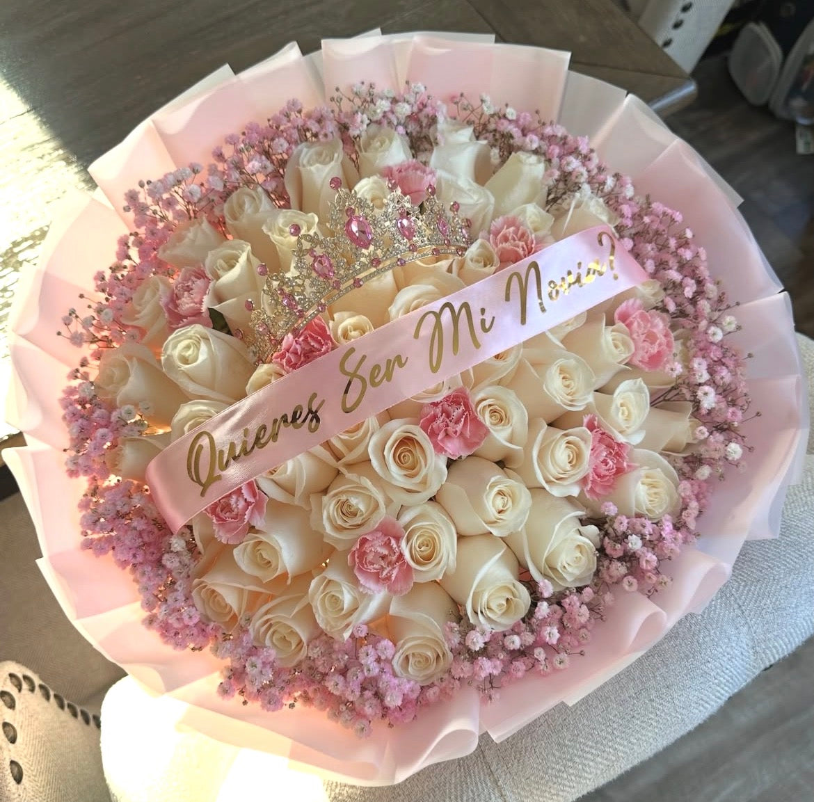 Descubre la manera perfecta de expresar tu amor con nuestra petición de 50 hermosas rosas blancas y un toque de gypsu en color rosa. La corona metálica y la cinta de petición con la frase “quieres ser mi novia” le darán un toque único y romántico a tu propuesta. ¡Haz que sea memorable con nuestra Petición!