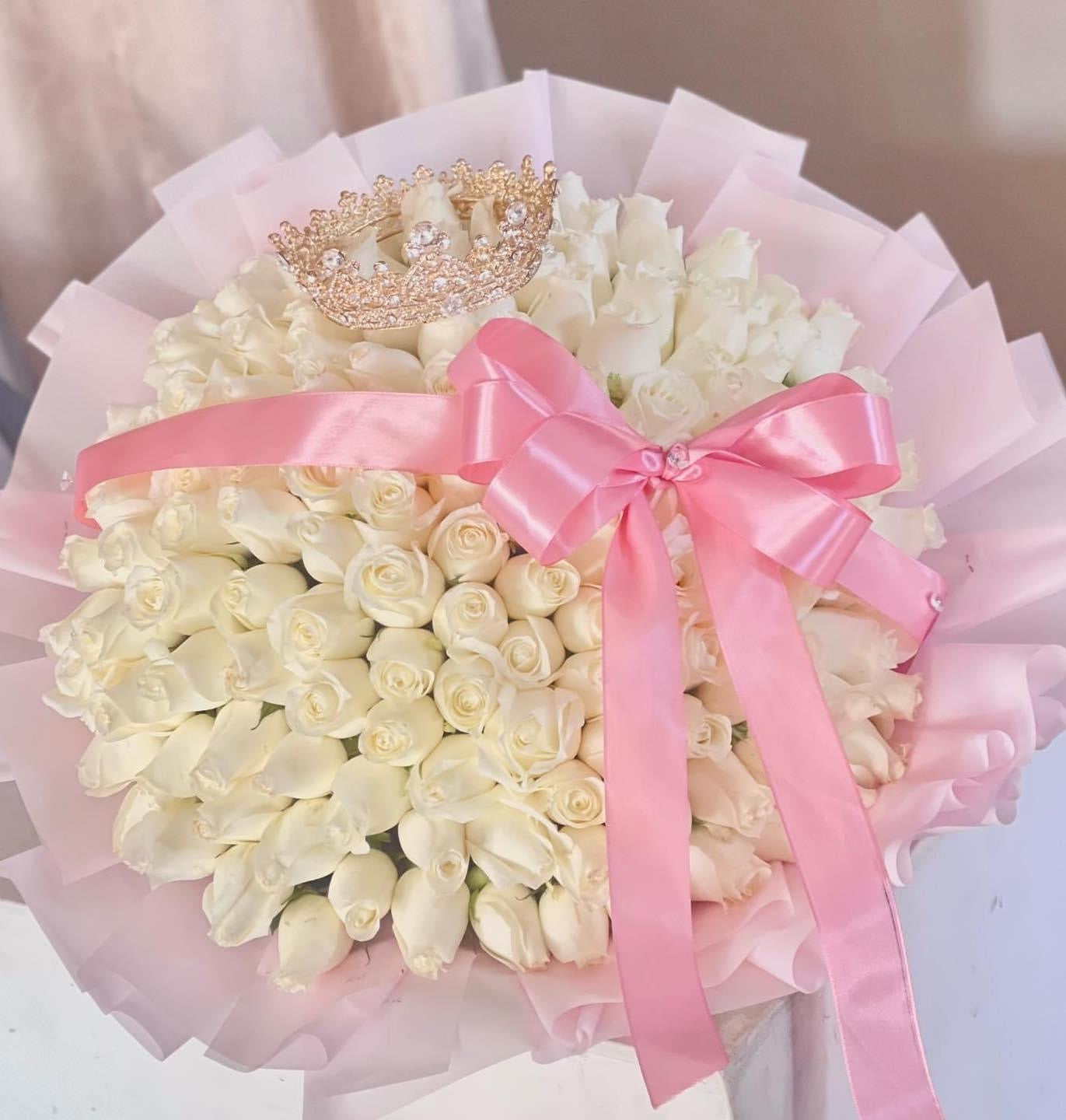 La Princesa es un hermoso ramo de 100 rosas blancas acompañadas de una corona y envueltas en papel rosa. La combinación perfecta para demostrar amor y elegancia. Con un toque de realeza, será el regalo ideal para esa persona especial.