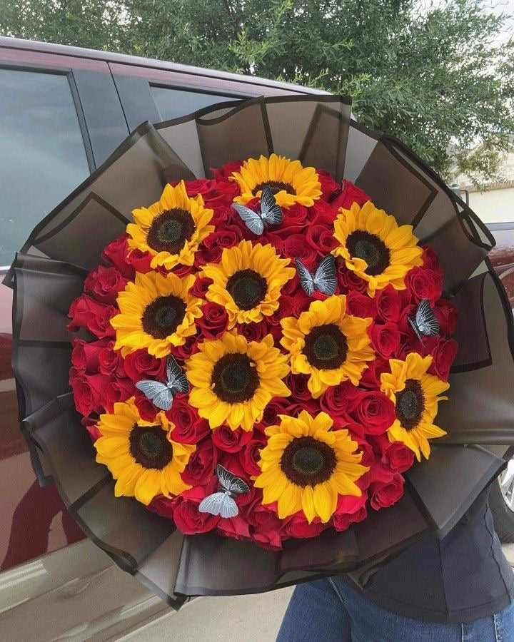 Descubre la intensidad de SOL ROJO, un arreglo audaz que combina 150 rosas rojas vibrantes con 10 girasoles radiantes, realzado con mariposas decorativas que aportan un toque único y atrevido. Perfecto para expresar pasión y energía con un estilo inconfundible.
