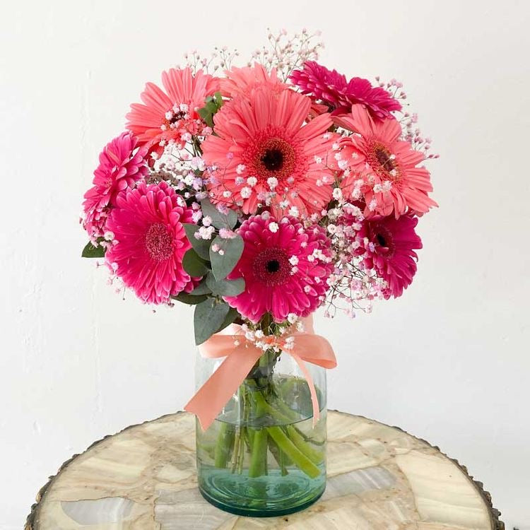 Este elegante arreglo floral presenta 12 gerberas en delicados tonos rosa pastel, combinadas con follaje fino que realza su frescura y sofisticación. Ideal para decorar espacios con un toque suave y natural, este florero aporta armonía y elegancia a cualquier ambiente. Perfecto para regalar o embellecer tu hogar con un estilo sutil y refinado.